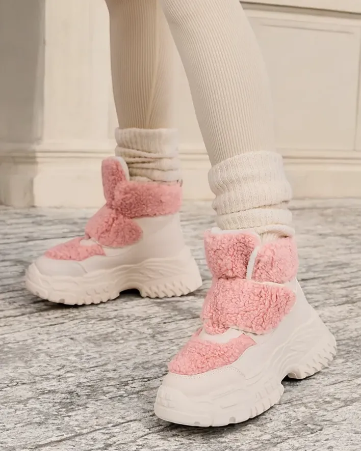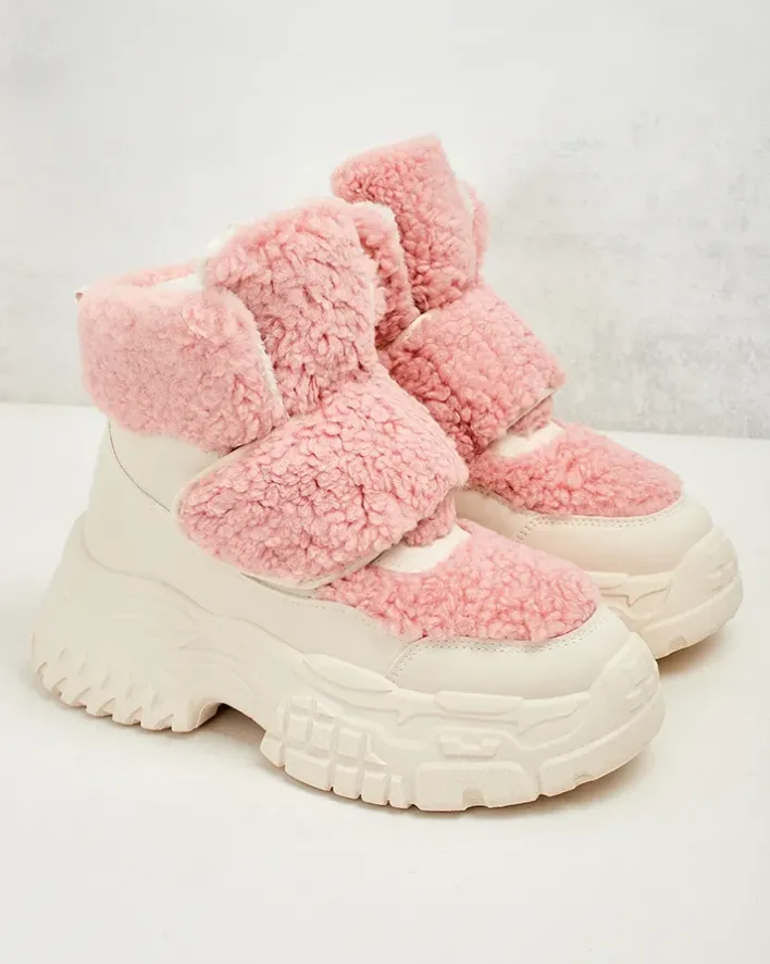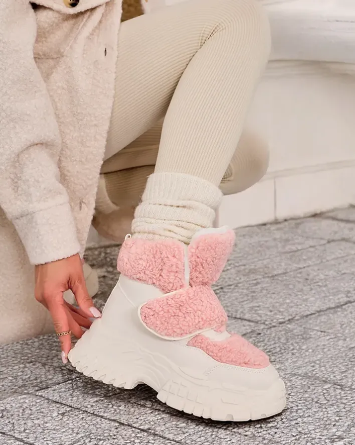 - Ponadczasowe damskie obuwie typu śniegowce. Cholewka wykonana ze skóry ekologicznej ze wstawkami a’la kożuszek. W środku ocieplenie w formie futerka, obuwie posiada zapięcie na rzep. Idealne na chłodniejszą porę roku!