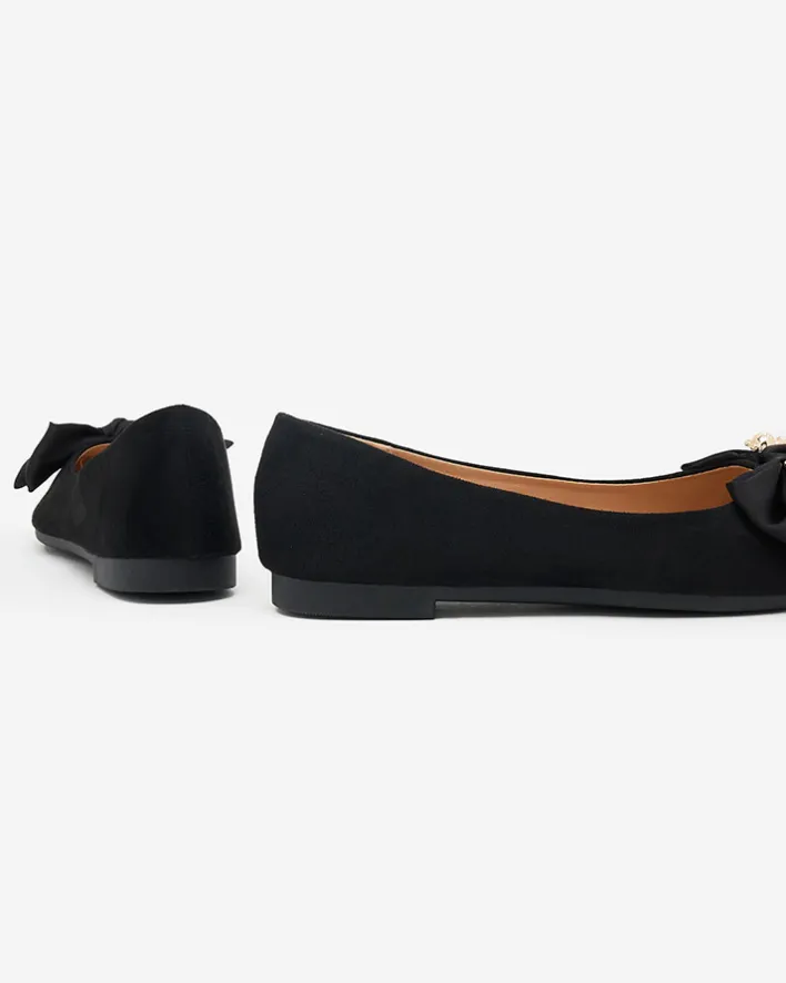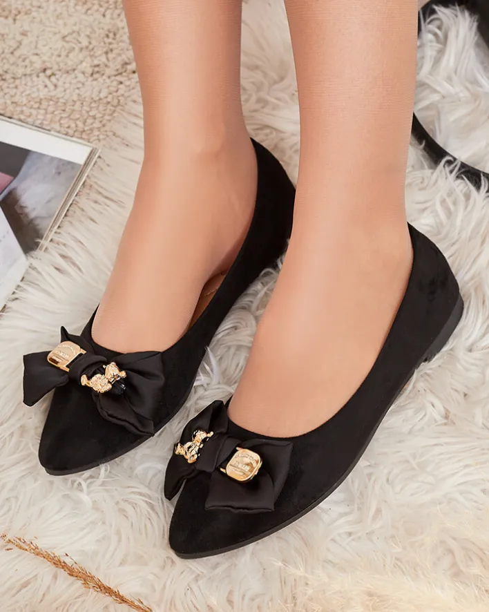 - Balerinki damskie na płaskim obcasie wykonane w całości ze skóry ekologicznej. Nosek w szpic i zdobiony kokardką. Super dodatek do Twoich casualowych outfitów!