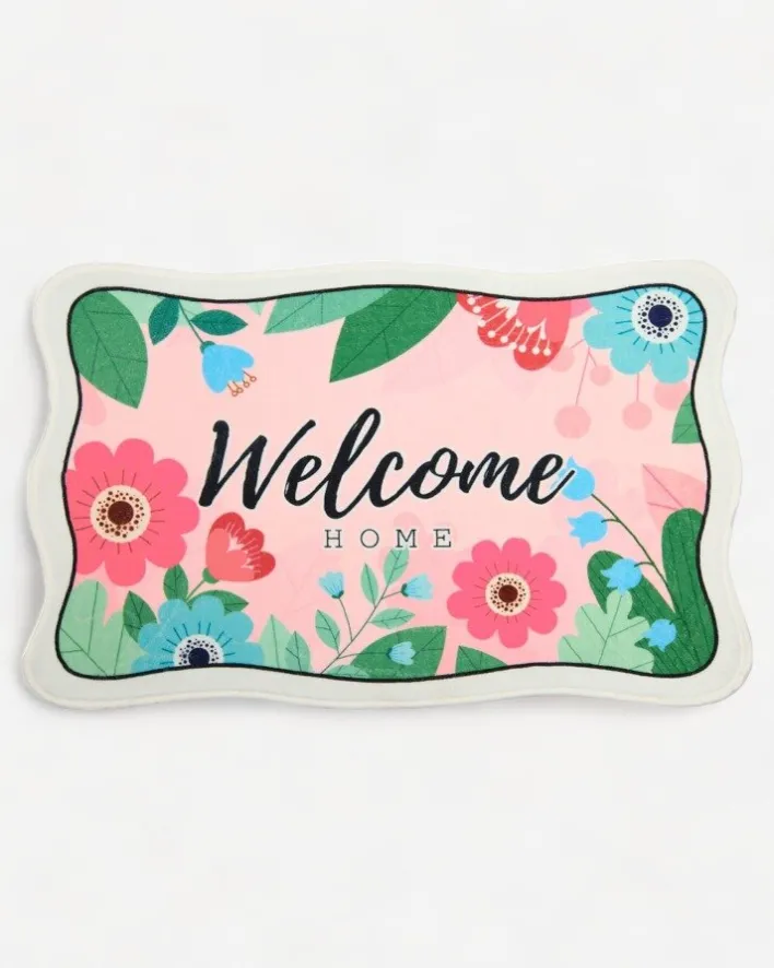 - Mały kolorowy dywanik wycieraczka z krótkim włosiem we wzór w kwiaty. Jest miękki i delikatny, przez co niezwykle przyjemny w dotyku. Dodatkowym atutem dywanu jest jego antypoślizgowy spód.