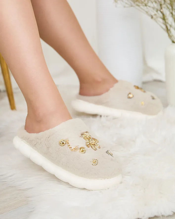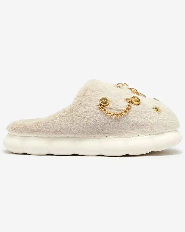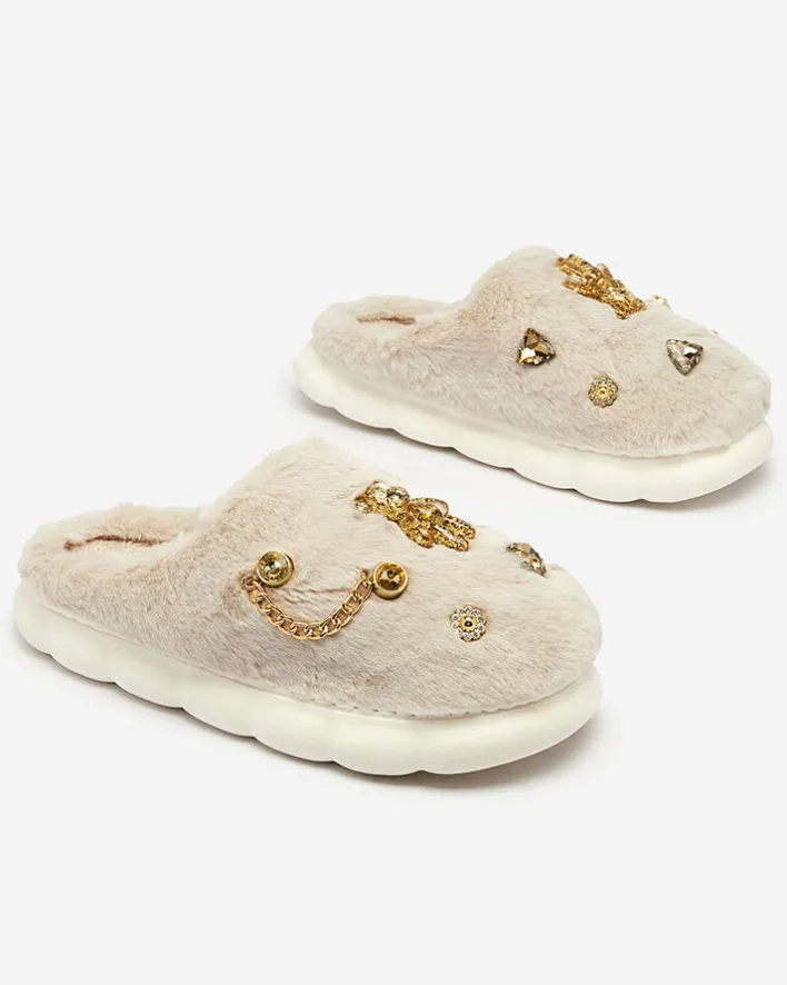 Kapcie^Royalfashion Beżowe damskie futrzane kapcie z ozdobami Erserra beżowy