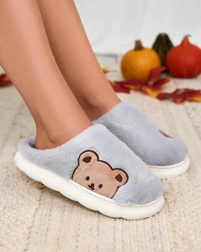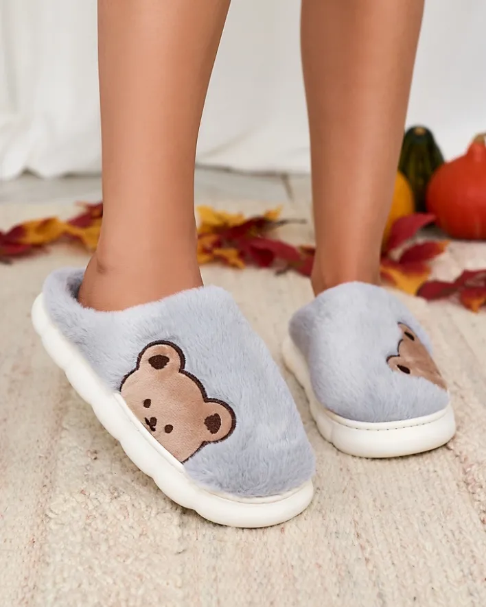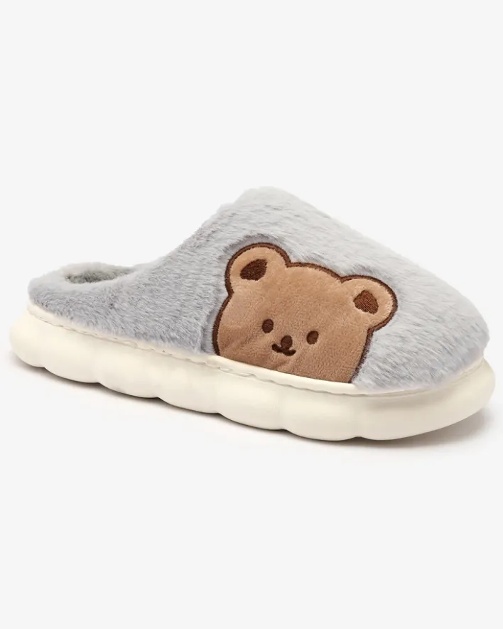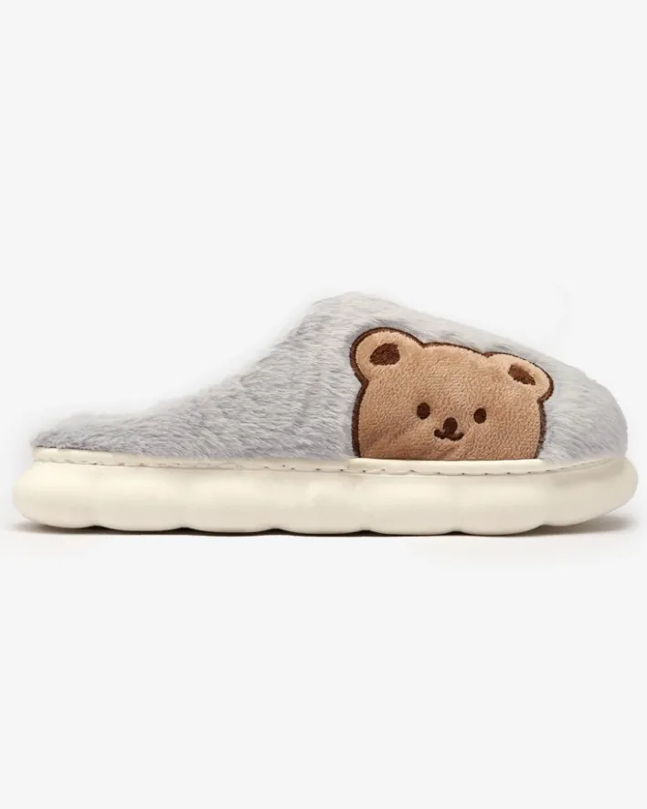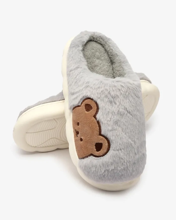 - Śliczne damskie kapcie na płaskiej podeszwie, zdobione naszywką z misiem. Model wykonany z materiału imitującego futerko. Świetna propozycją dla domowych outfitów!