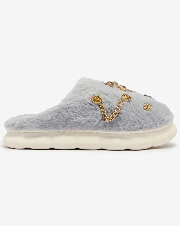 - Rewelacyjne damskie kapcie na płaskiej podeszwie, zdobione łańcuszkami i plastikowymi ozdobami w kształcie misia. Model wykonany z materiału imitującego futerko. Świetna propozycja dla domowych outfitów!