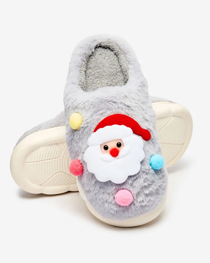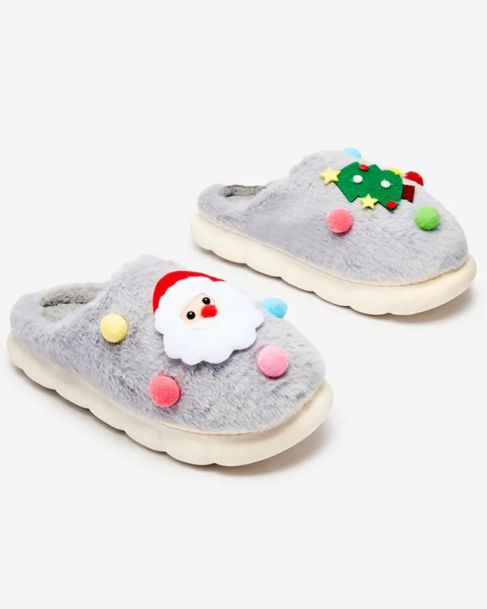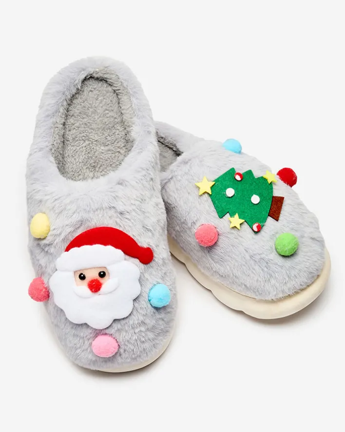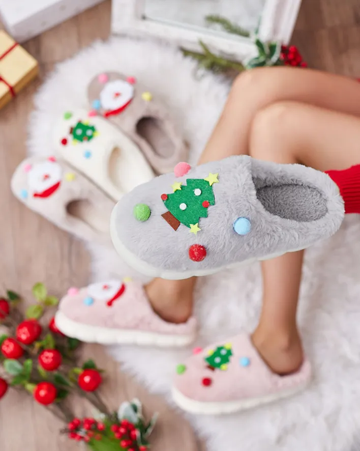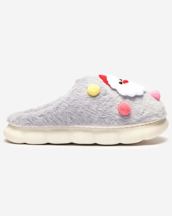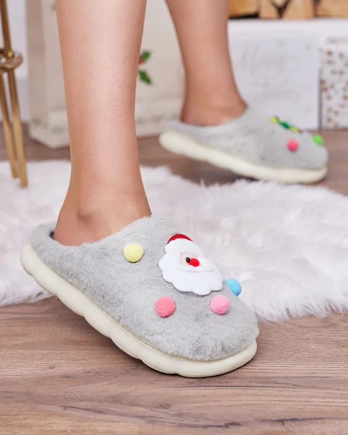 - Śliczne damskie kapcie na płaskiej podeszwie, zdobione świątecznymi naszywkami. Model wykonany z materiału imitującego futerko. Świetna propozycją dla domowych outfitów!