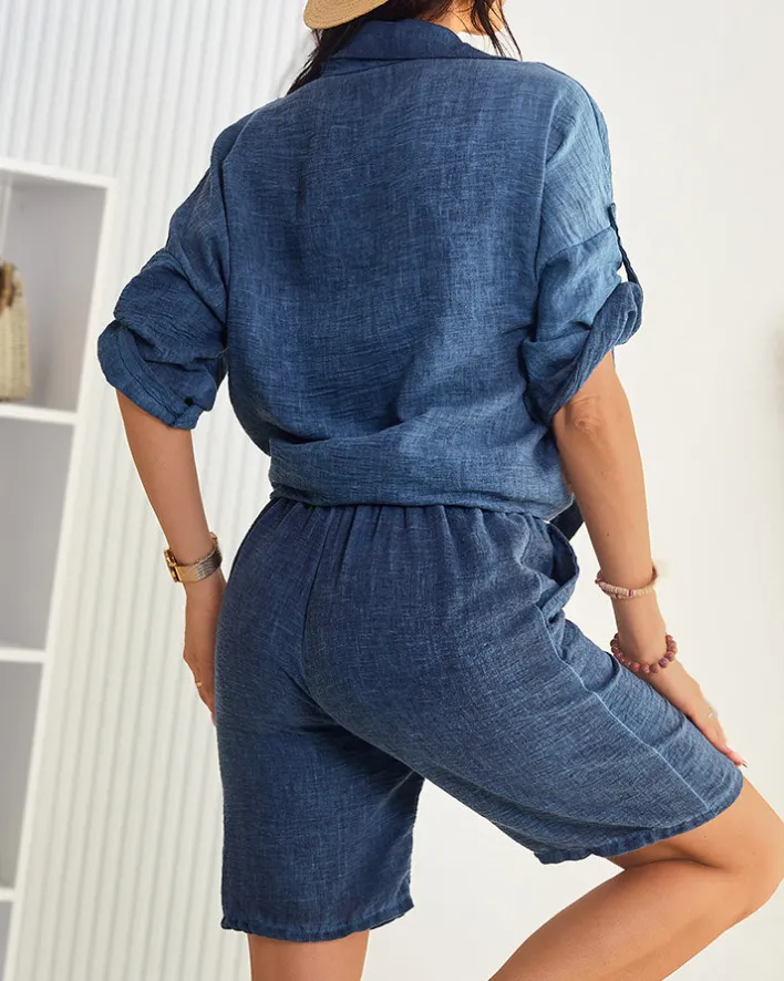 - Damski koszulowy komplet wykonany z przyjemnego materiału. Bluzka z rękawami 3/4 oraz krótkie spodenki z gumą w pasie. Poczuj lato w tym wspaniałym komplecie!