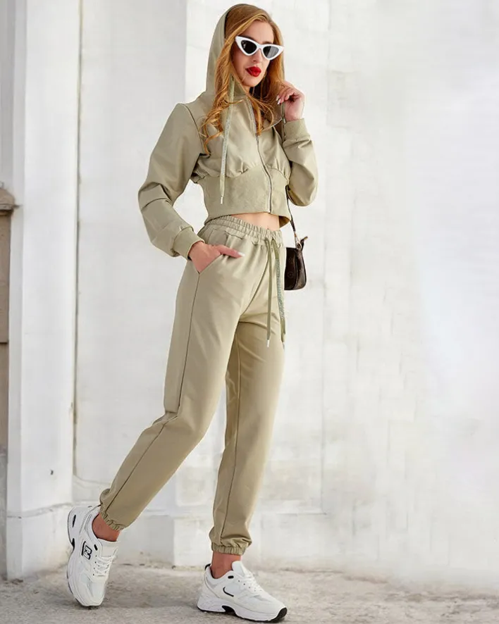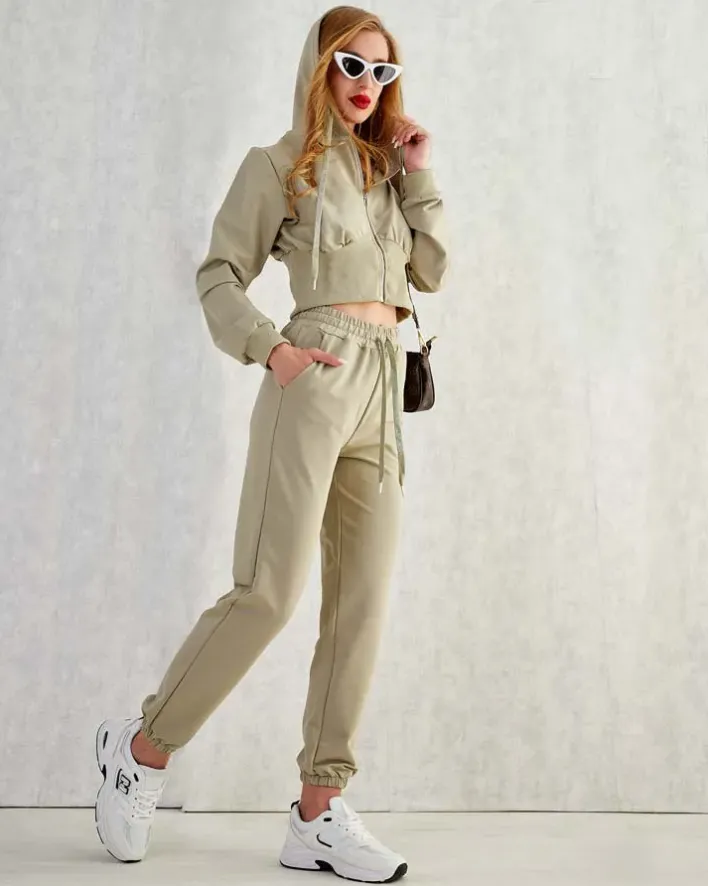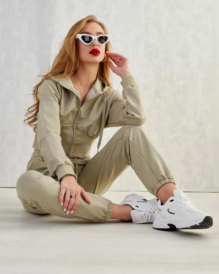 - Damski komplet dresowy wykonany z przyjemnej tkaniny. Bluza zapinana na suwak, z kapturem oraz spodnie z gumką w pasie z troczkami i 2 kieszeniami. Troczki zdobione cyrkoniami. UWAGA: Dokładność pomiaru (+/-) 1 cm.