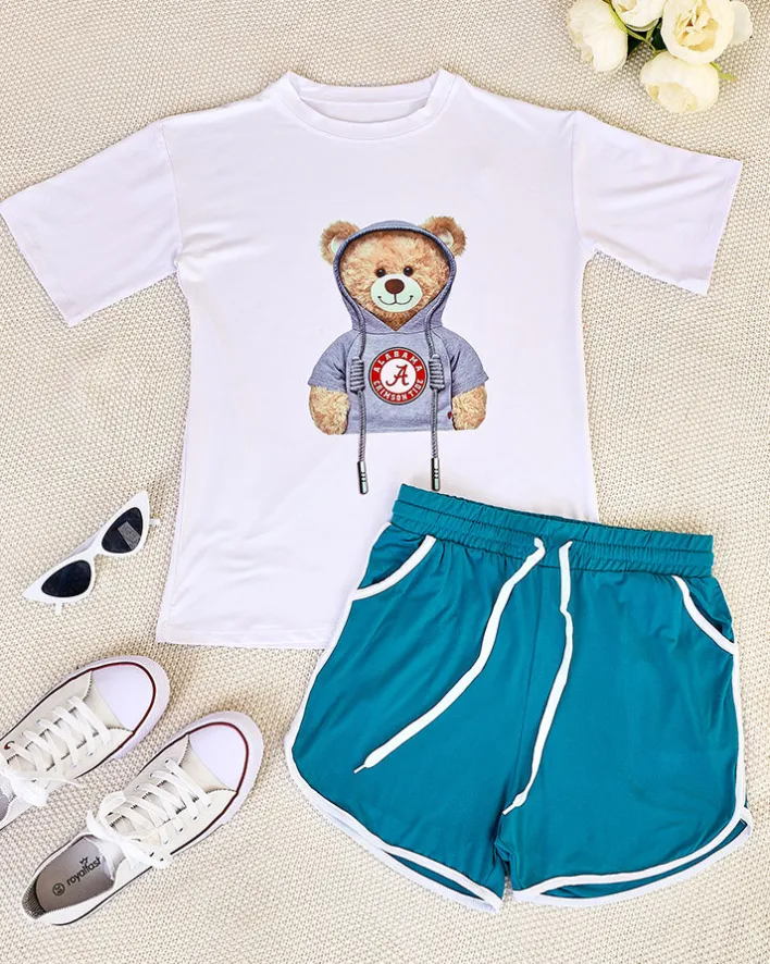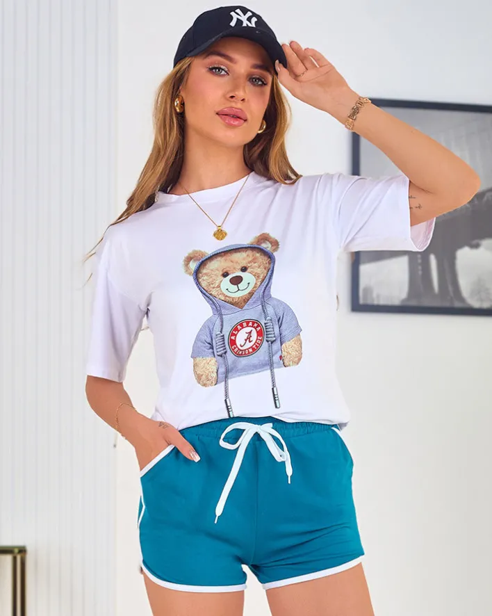 - Damski komplet wykonany z przyjemnego materiału. Model posiada nadruk z misiem. Bluzka z krótkimi rękawami oraz krótkie spodenki z gumą w pasie. Poczuj lato w tym wspaniałym komplecie!