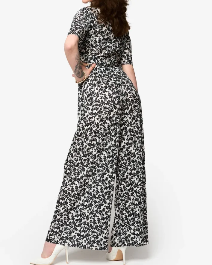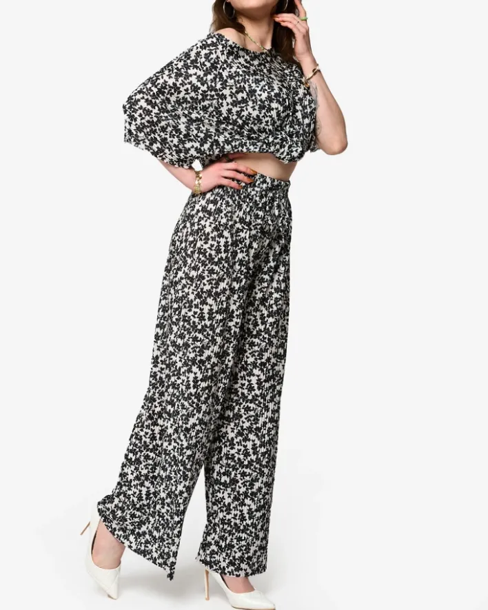 - Kwiecisty damski komplet wykonany ze śliskiej tkaniny plisowanej. Bluzka z okrągłym dekoltem, posiada krótkie rękawy. Spodnie typu palazzo z szeroką gumą w pasie i ozdobnymi troczkami. UWAGA: Dokładność pomiaru (+/-) 1 cm.