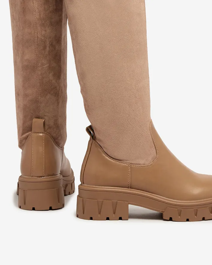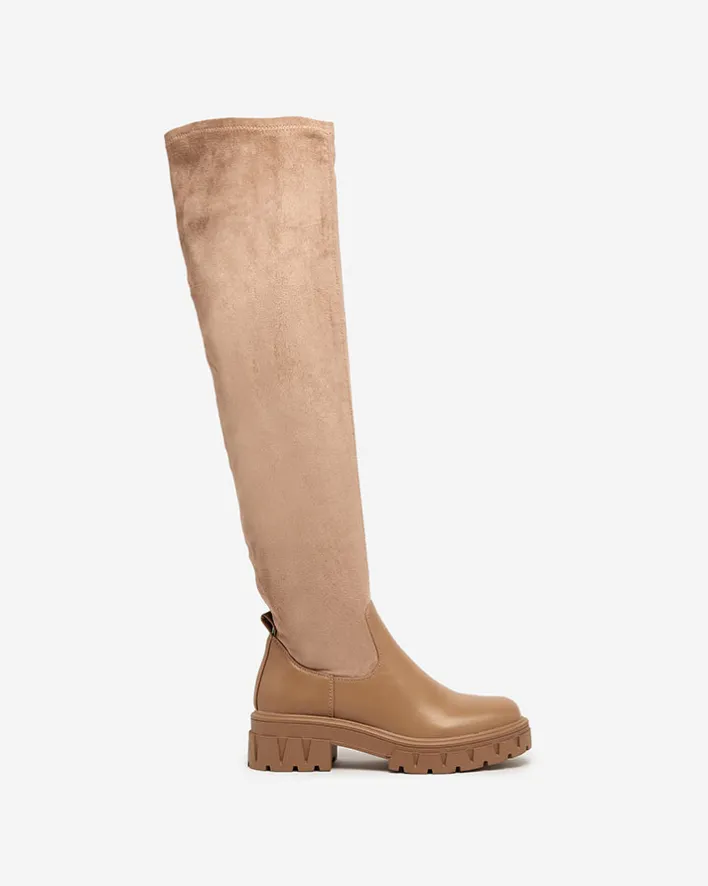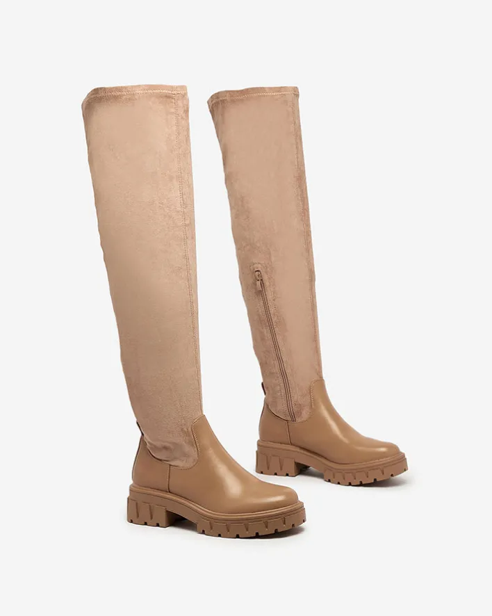 - Stylowe damskie kozaki za kolano na grubszej podeszwie. Cholewka wykonana jest z eko skóry zamszowej i posiada eko-skórzane wstawki. Wkładka tkaninowa. Model zapinany na suwak do połowy łydki.