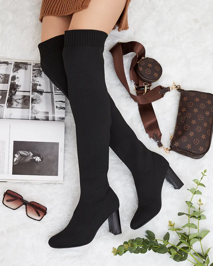 - Stylowe damskie kozaki za kolano na słupku. Cholewka wykonana jest z elastycznego materiału tkaninowego i posiada tkaninową wkładkę. Model wsuwany.