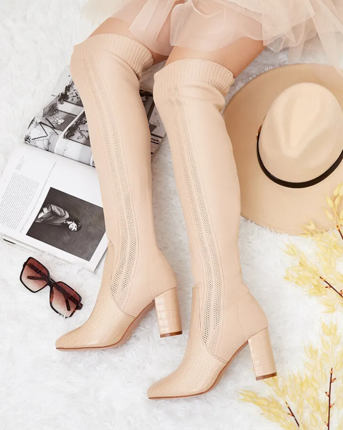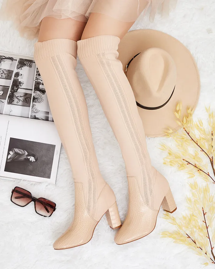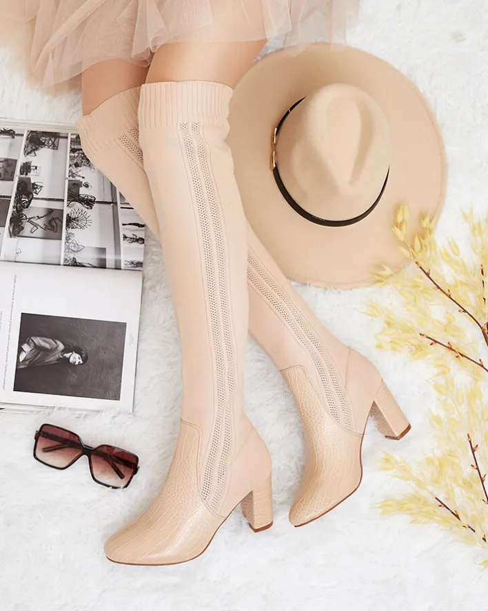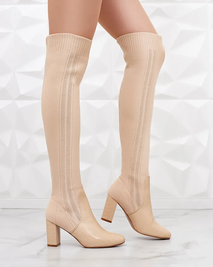 - Stylowe damskie kozaki za kolano na słupku. Cholewka wykonana jest z elastycznego materiału tkaninowego i posiada eko skórzane wstawki z tłoczeniem. W środku tkaninowa wkładka. Model wsuwany.