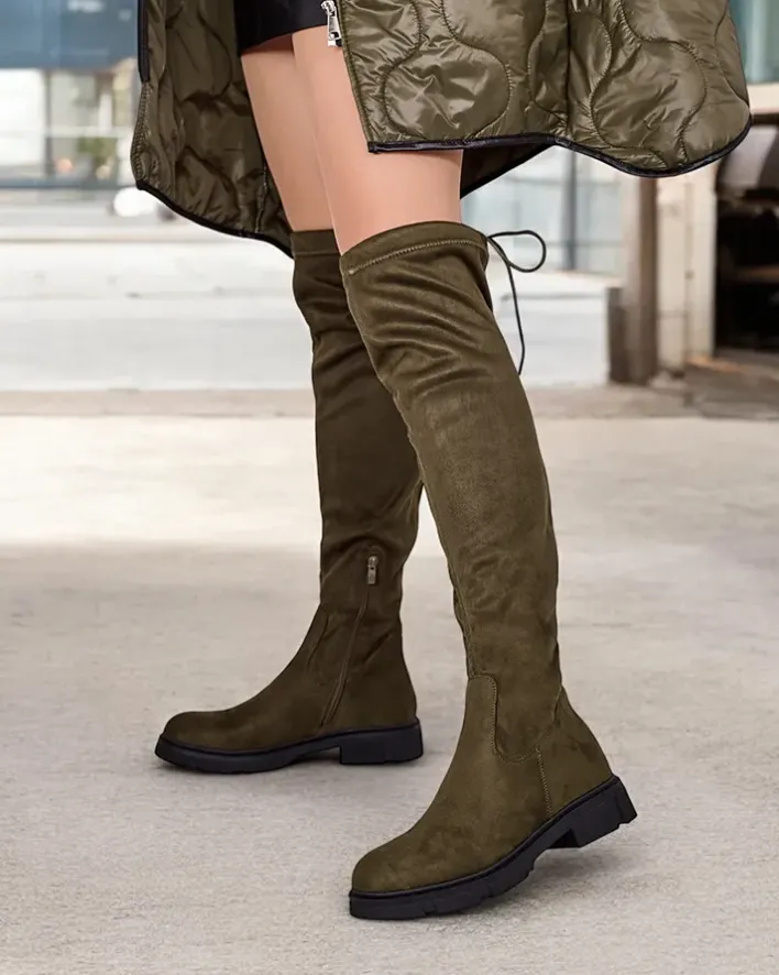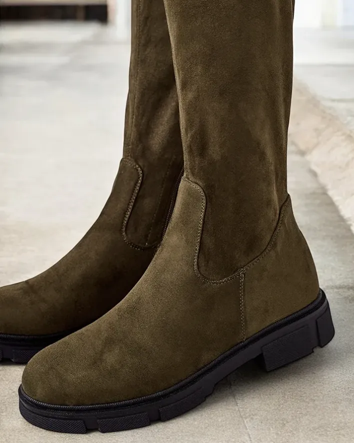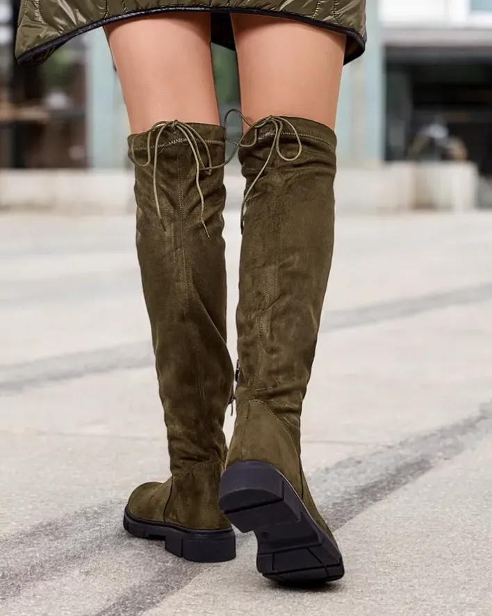 - Stylowe damskie kozaki do kolana na płaskiej podeszwie. Cholewka wykonana jest z elastycznego materiału tkaninowego, w środku tkaninowa wkładka. Model wsuwany. Idealne do codziennych jesiennych outfitów!