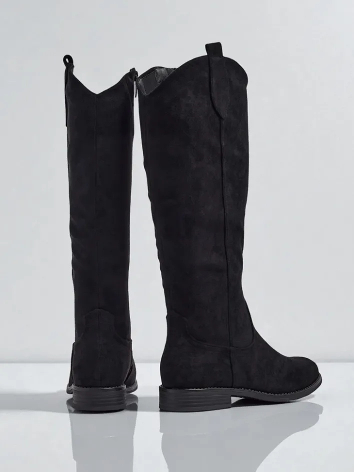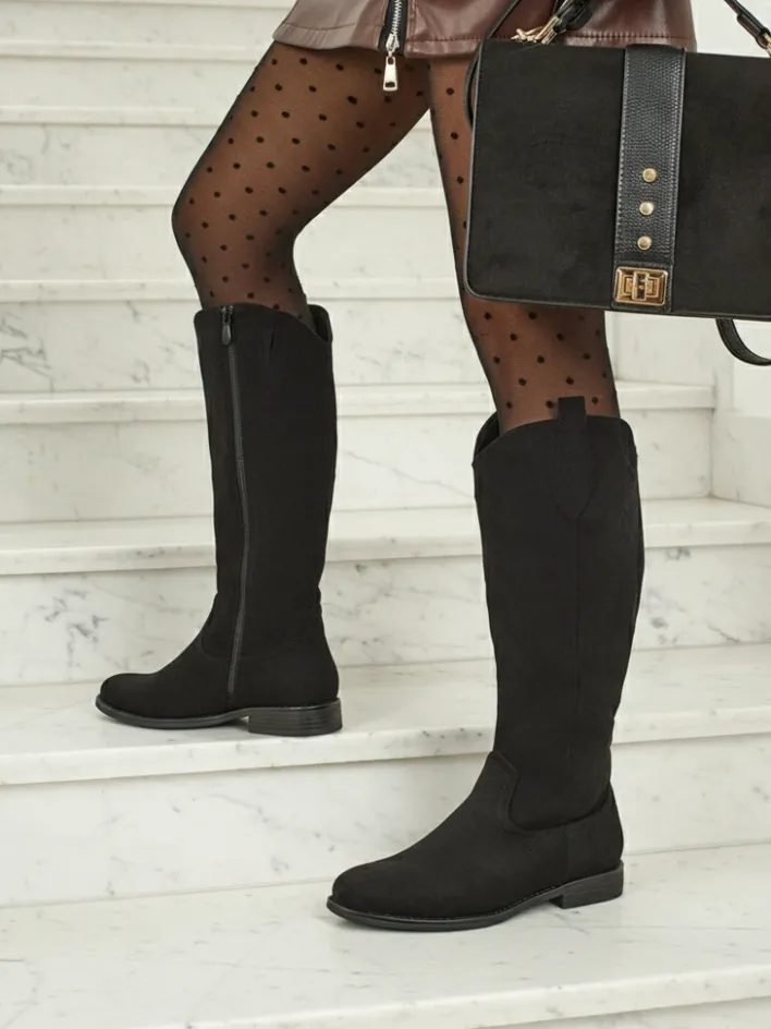 - Stylowe damskie kozaki do kolana na płaskiej podeszwie. Cholewka wykonana jest z eko skóry zamszowej, w środku ocieplenie w formie futerka. Model zapinany na suwak. Idealne do codziennych jesiennych outfitów!