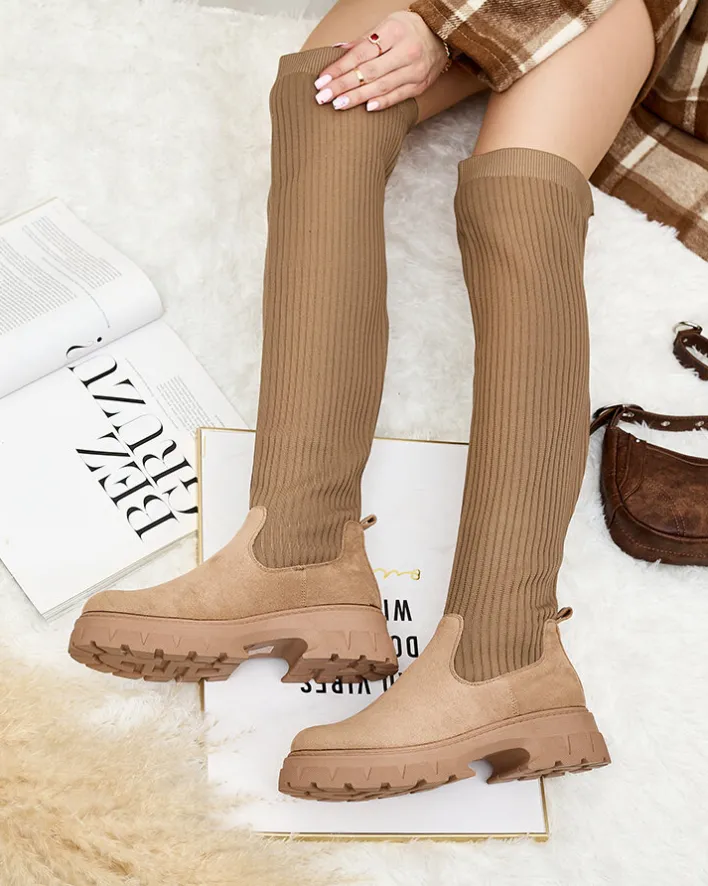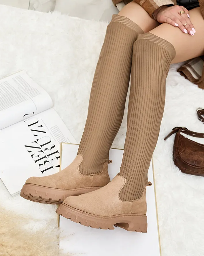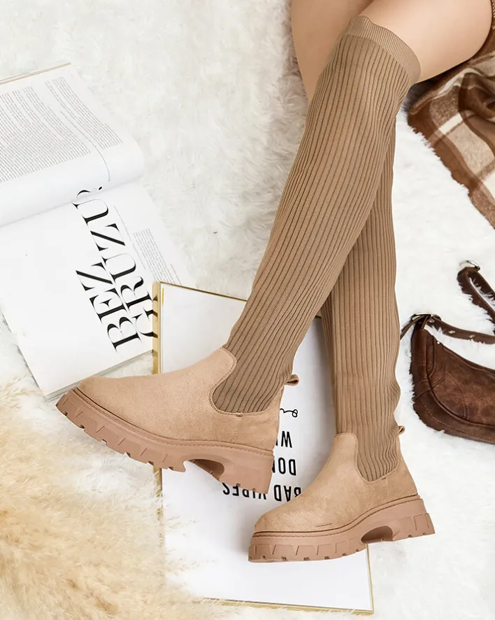 - Stylowe damskie kozaki za kolano na grubszej podeszwie. Cholewka wykonana jest z elastycznego materiału tkaninowego prążkowanego i posiada eko zamszowe wstawki. Wkładka futerkowa. Model wsuwany.