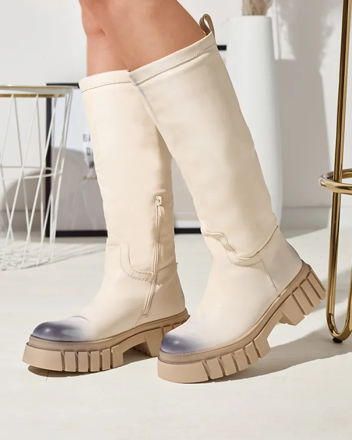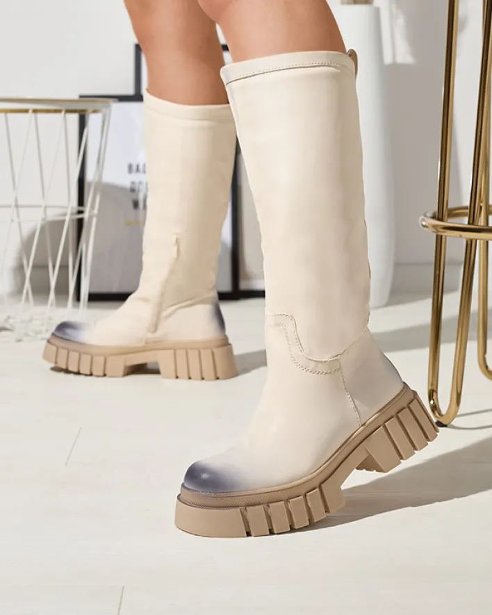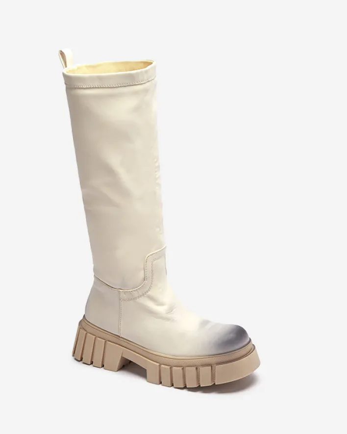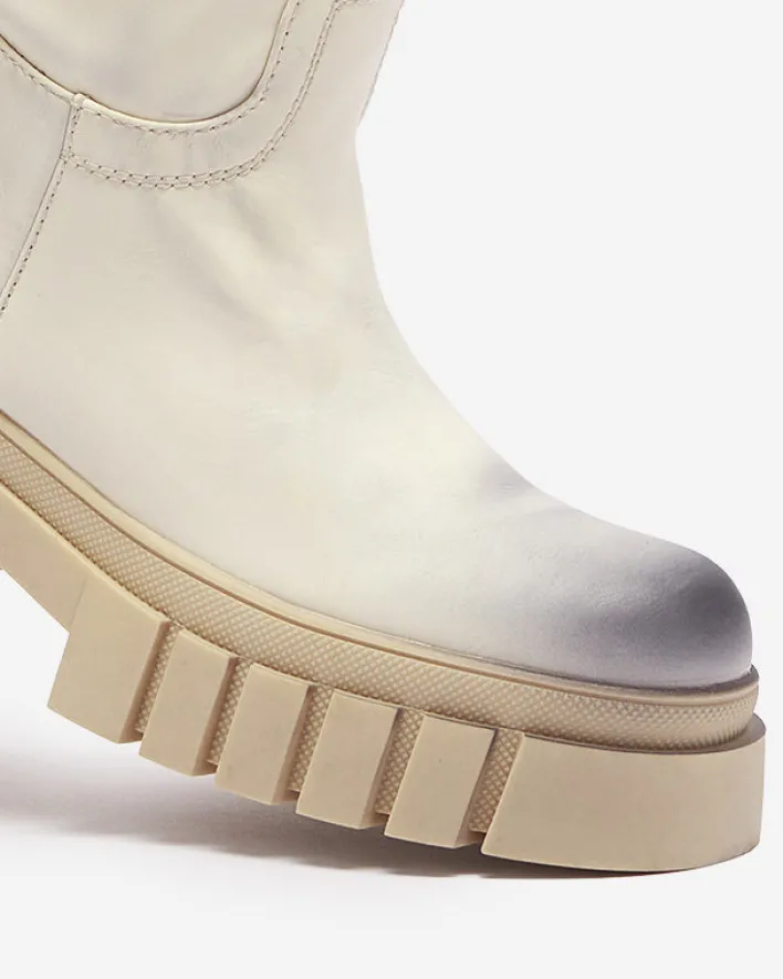 - Delikatnie cieniowane damskie kozaki do połowy łydki, wykonane ze skóry ekologicznej. Model na płaskim obcasie. Posiada ocieplenie w formie delikatnego futerka. Na nosku i pięcie ozdobne przebarwienia.