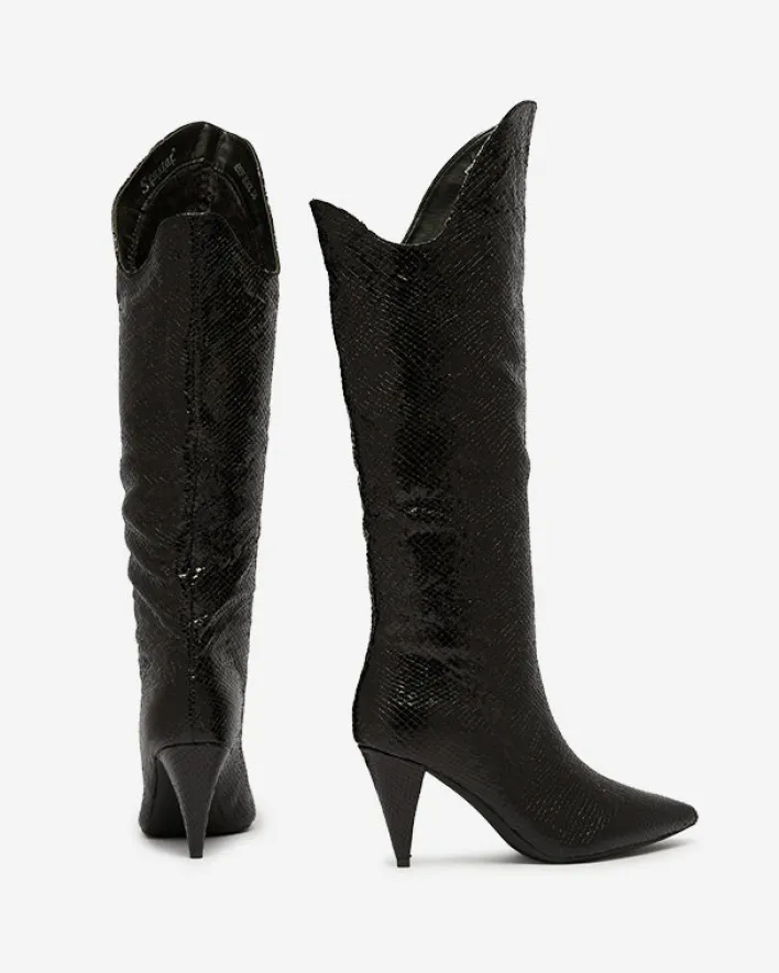 - Błyszczące damskie kozaki na szpilce wykonane z eko skóry zdobionej tłoczeniem. Posiadają delikatne ocieplenie. Model wsuwany. Nosek w szpic dodaje im charakteru! CZARNE DAMSKIE OCIEPLANE KOZAKI ELIVEA