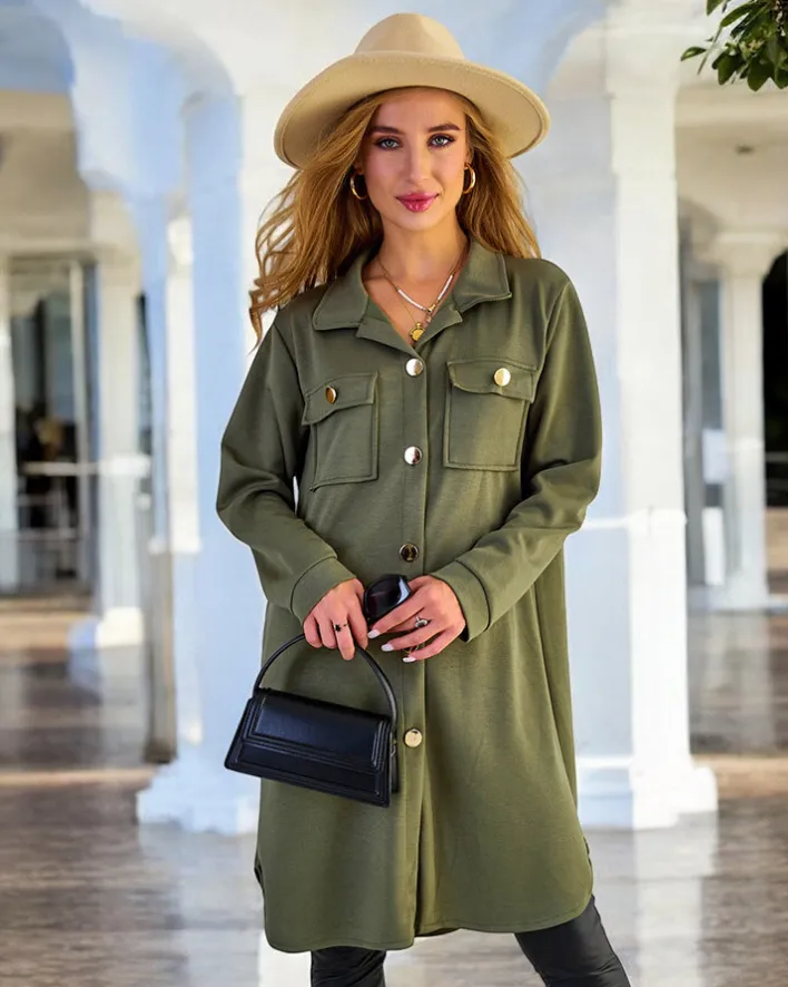 - Stylowy damski płaszcz typu koszula z ozdobnymi guzikami. Płaszcz o kroju over size, posiada długie rękawy, elegancki kołnierzyk i 2 kieszenie. Świetny na jesień!