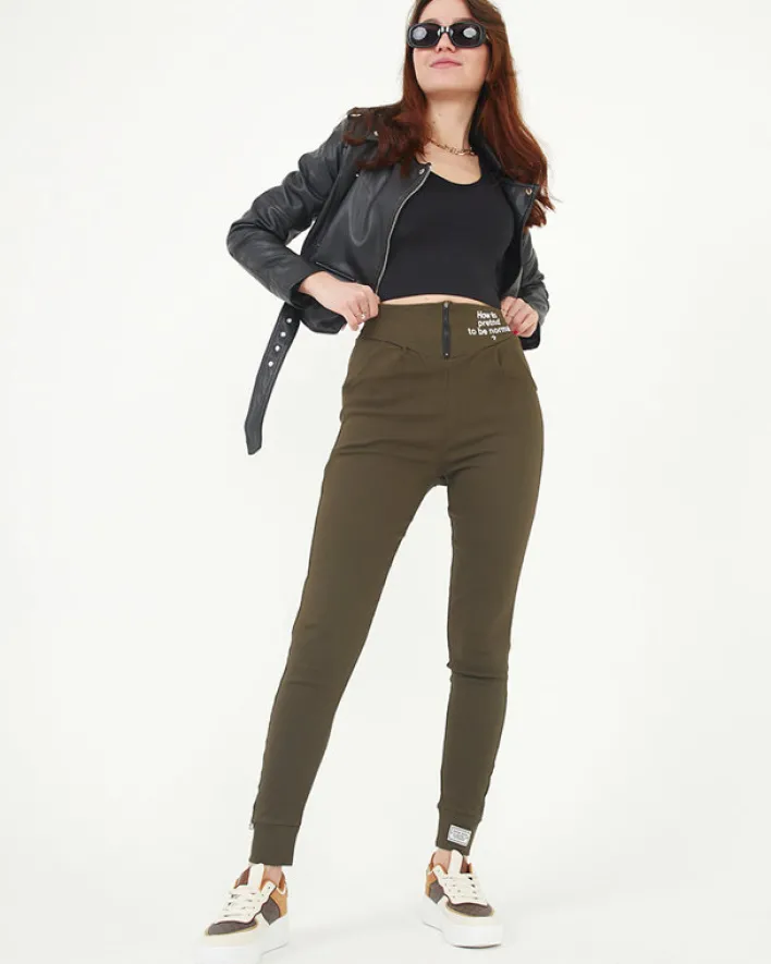 - Stylowe damskie spodnie z wysokim stanem wykonane z przyjemnej, rozciągliwej tkaniny. Model posiada gumę w pasie, a z przodu zapięcie na zamek oraz modne napisy. Must have w szafie każdej kobiety! UWAGA: Dokładność pomiaru (+/-) 1 cm.