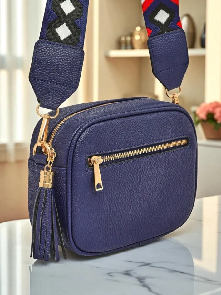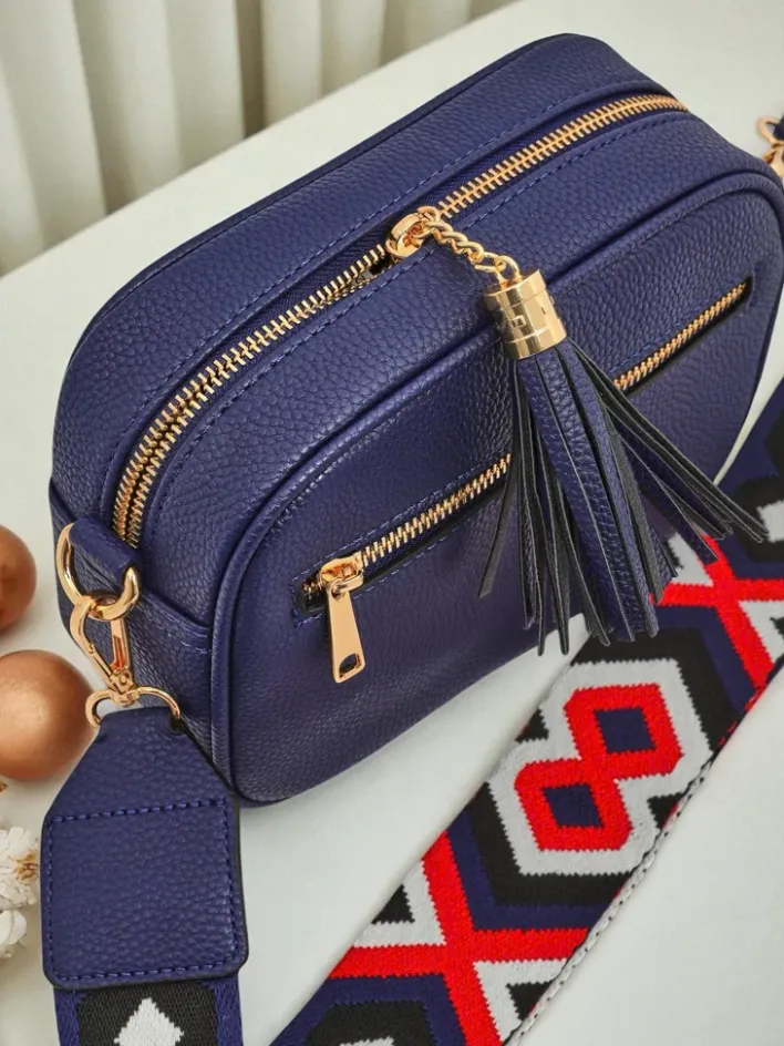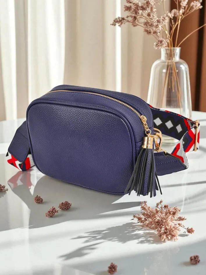 - Stylowa mała torebka z eko skóry z kolorowym paskiem i uroczym frędzelkiem. 1 komora, 2 kieszonki, regulowany i odpinany pasek. Idealna na co dzień i na wyjścia – kompaktowa, a pomieści wszystko, co ważne.