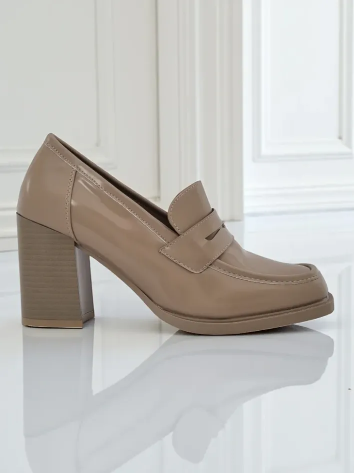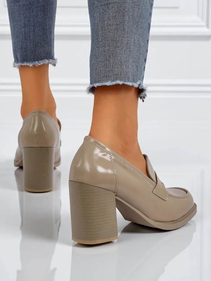 - Klasyczne damskie mokasyny na obcasie. Model całościowo wykonany z eko skóry. Obuwie posiada subtelną ozdobę na cholewce. Idealna baza na co dzień!