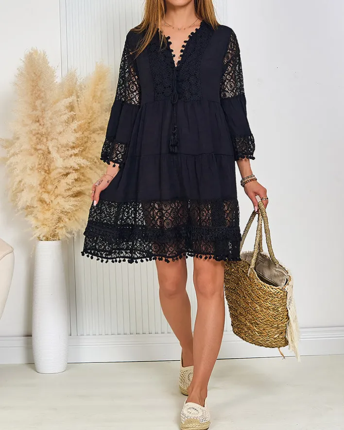 - Damska narzutka plażowa typu sukienka, wykonana z miękkiej tkaniny zdobionej wstawkami z koronki. Model z długimi rękawami 3/4 oraz dekoltem w serek. UWAGA: Dokładność pomiaru (+/-) 1 cm.