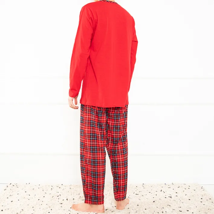 - Ciepła piżama męska w kolorze czerwonym, wykonana z materiału bawełnianego. Model zdobiony świątecznym printem, spodnie w kratkę, bluzka z reniferem. Idealny prezent na święta dla Twojego mężczyzny! UWAGA: Dokładność pomiaru (+/-) 1 cm.