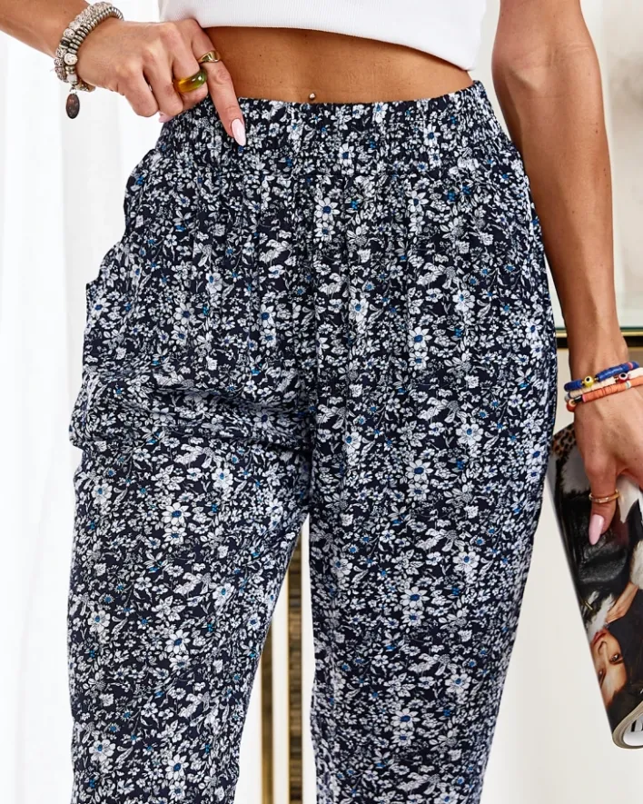 - Lekkie letnie damskie spodnie materiałowe, zdobione printem w kwiaty. Produkt posiada szeroką i elastyczną gumę w pasie oraz dwie wsuwane kieszenie. Idealnie się sprawdzą w gorące letnie dni. UWAGA: Dokładność pomiaru (+/-) 1 cm.