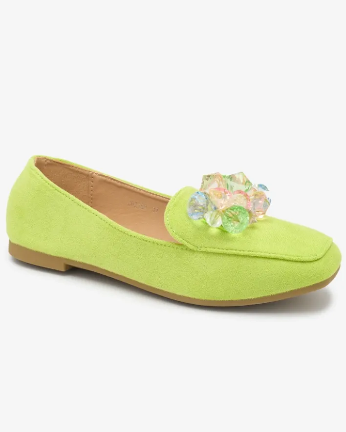 - Damskie mokasyny wykonane ze skóry ekologicznej zamszowej, wkładka ze skóry naturalnej. Kwadratowy nosek zdobiony plastikowymi koralikami.
