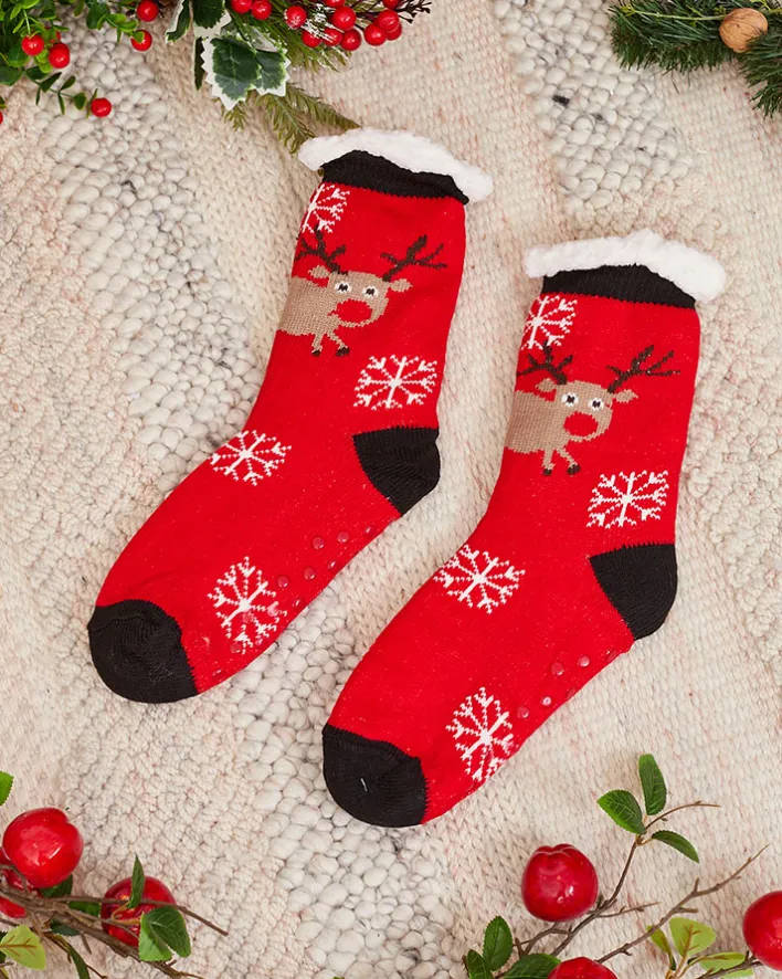 - Przepiękne damskie grube skarpety wykończone świątecznym wzorem z antypoślizgowym spodem. W środku ocieplane białym, cieplutkim kożuszkiem. Skarpetki świetnie się sprawdzą na chłodniejsze wieczory.