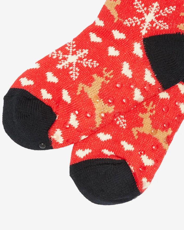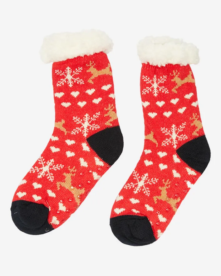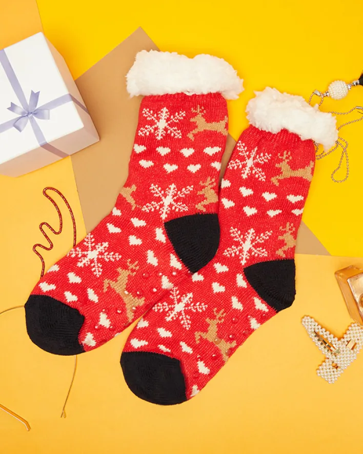 - Przepiękne damskie grube skarpety wykończone świątecznym wzorem z antypoślizgowym spodem. W środku ocieplane białym, cieplutkim kożuszkiem. Skarpetki świetnie się sprawdzą na chłodniejsze wieczory.