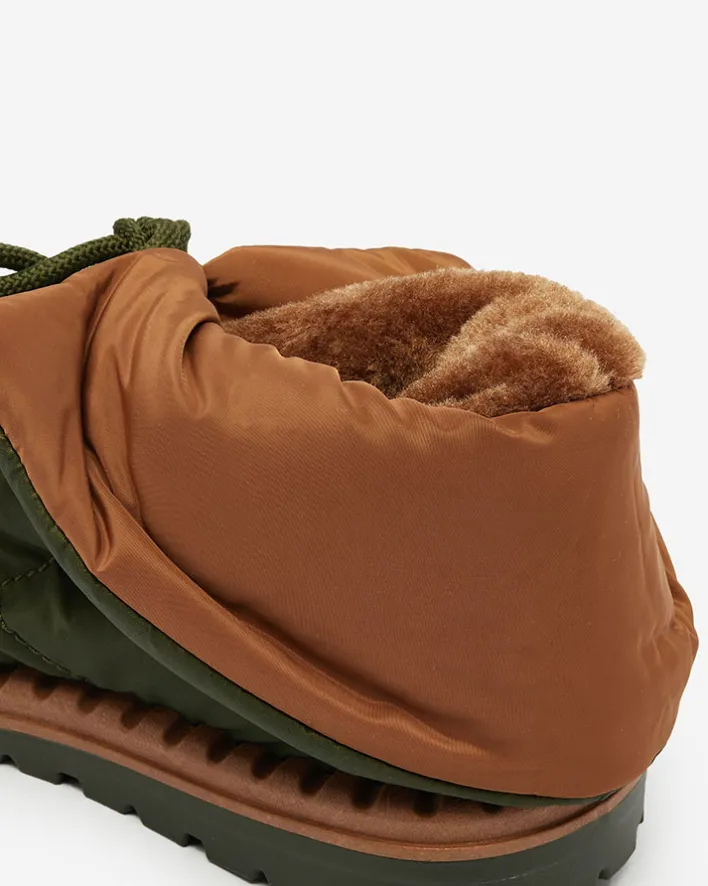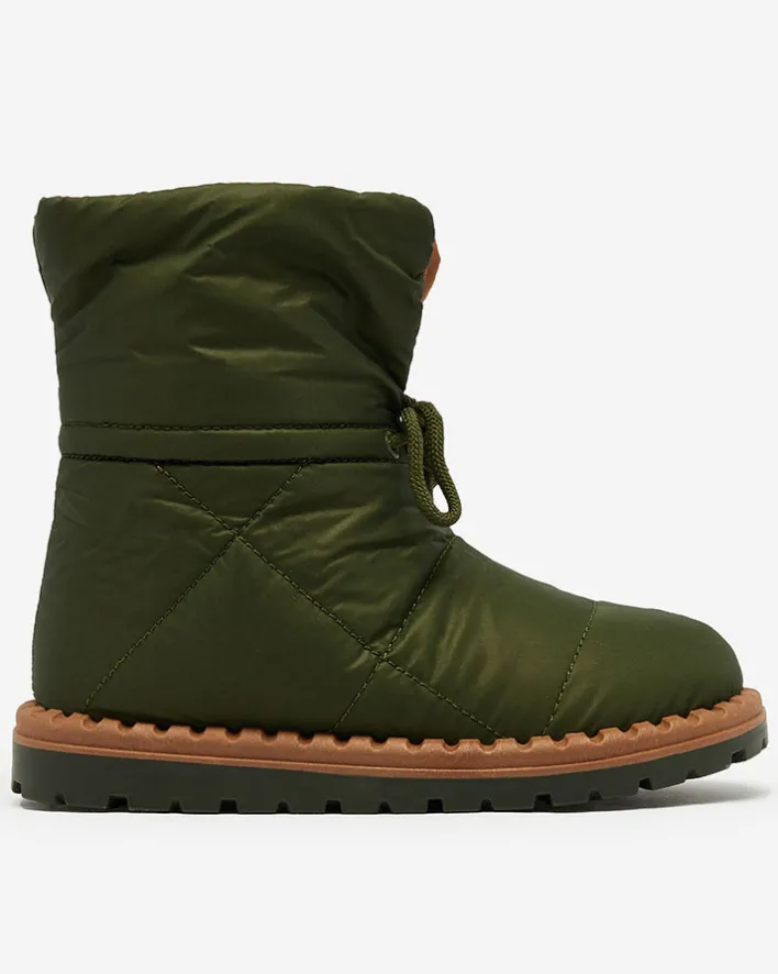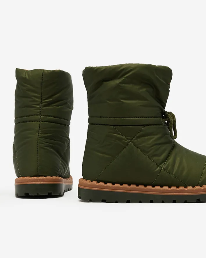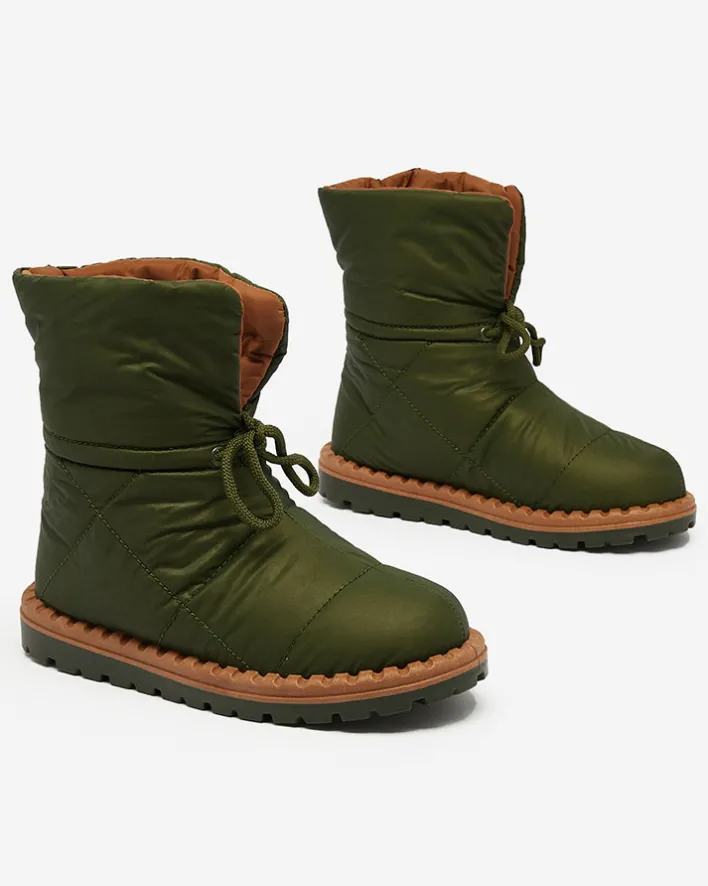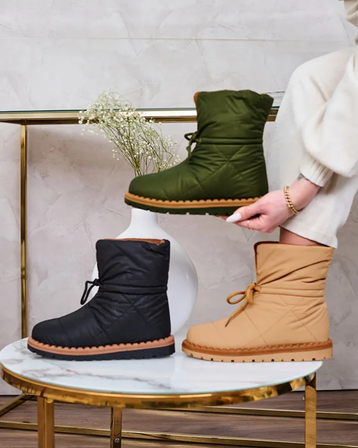 - Damskie obuwie typu śniegowce z cholewką wykonaną z materiału a’la cerata. W środku ocieplenie w formie futerka, obuwie wsuwane i posiada ściągacz. Idealne na chłodniejszą porę roku!