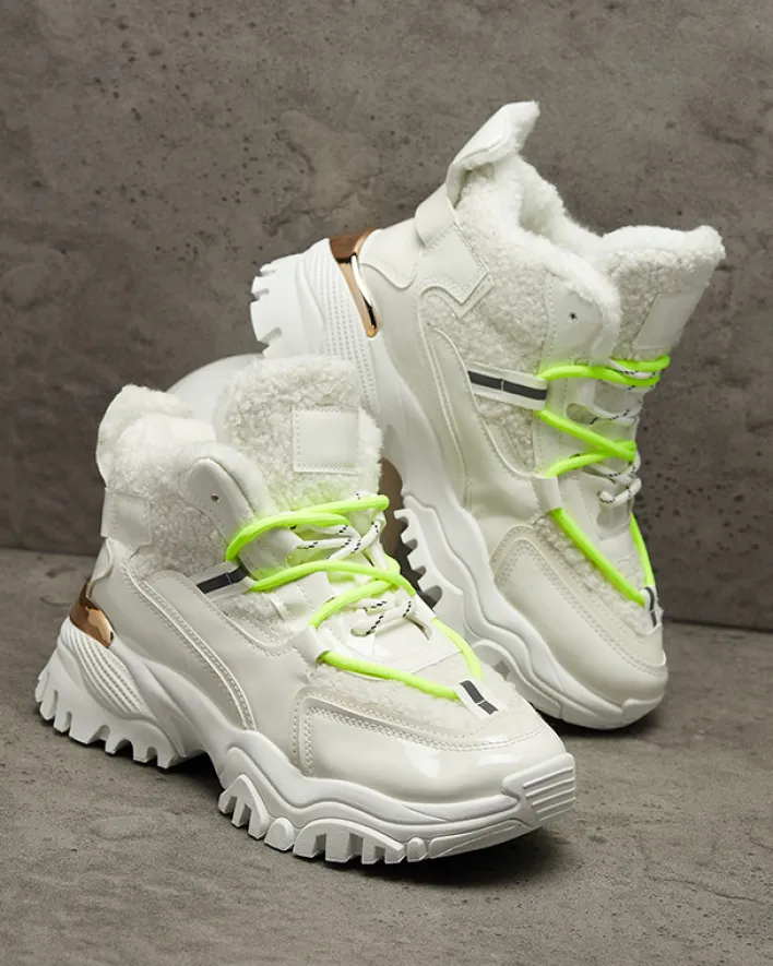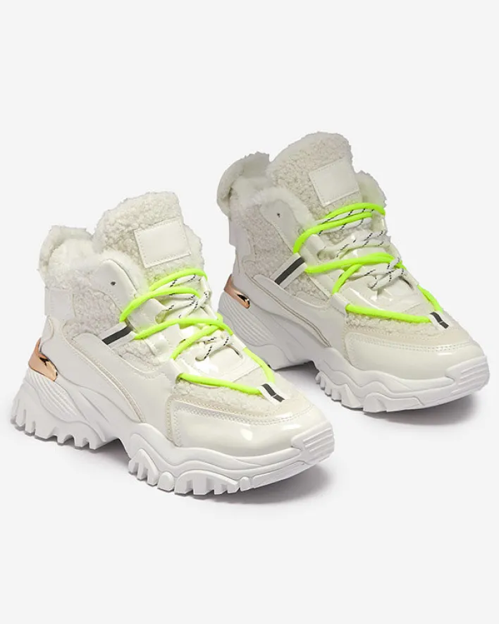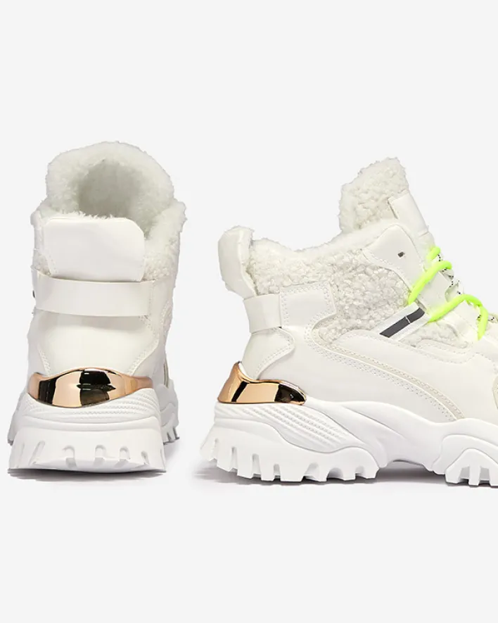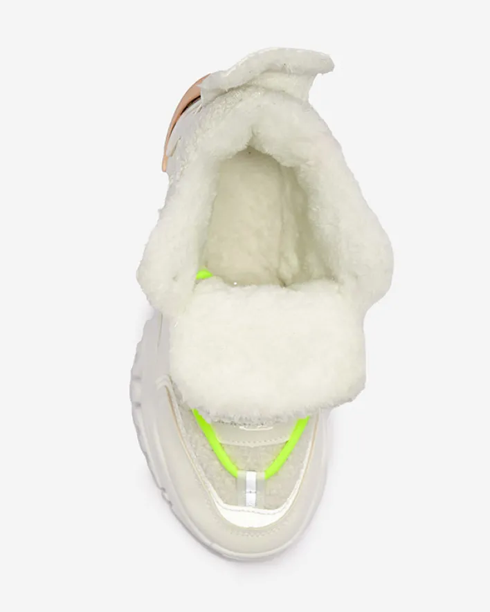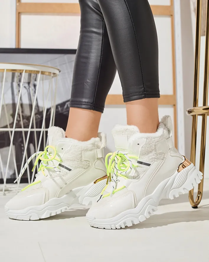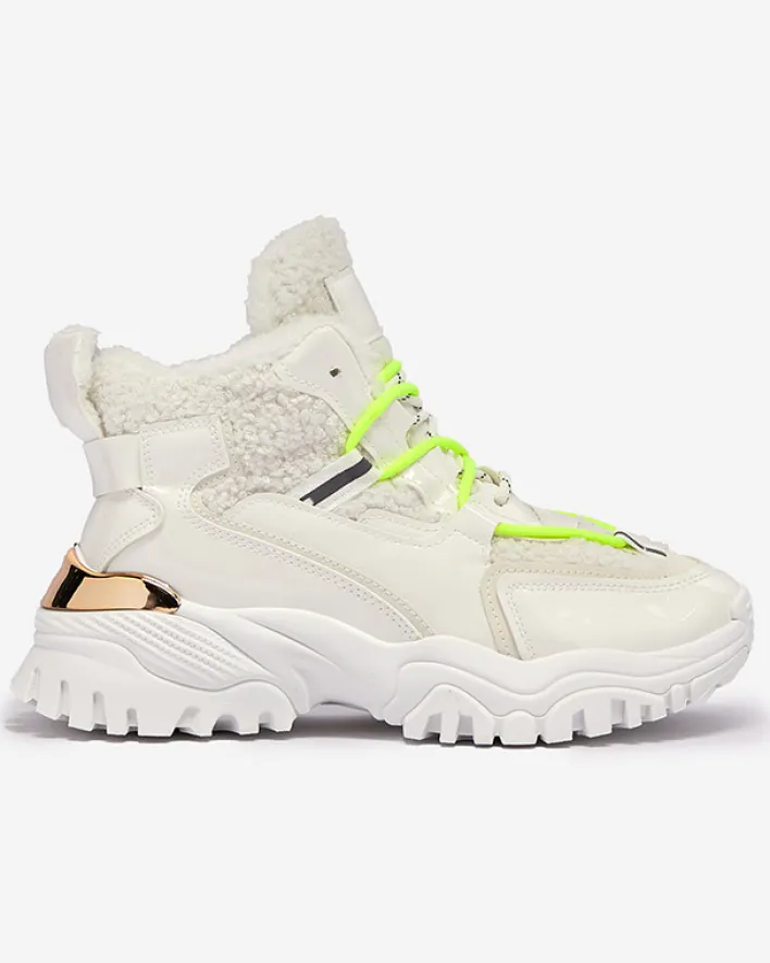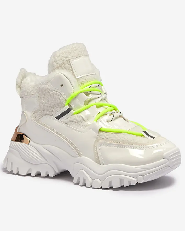 - Sportowe sneakersy damskie na grubej podeszwie, cholewka jest sznurowana i wykonana z połączenia lakierowanej eko skóry oraz tkaniny a’la futerko. Wnętrze w całości ocieplone sztucznym futerkiem. BIAŁE SPORTOWE BUTY ZIMOWE DAMSKIE ŚNIEGOWCE SAGGLO