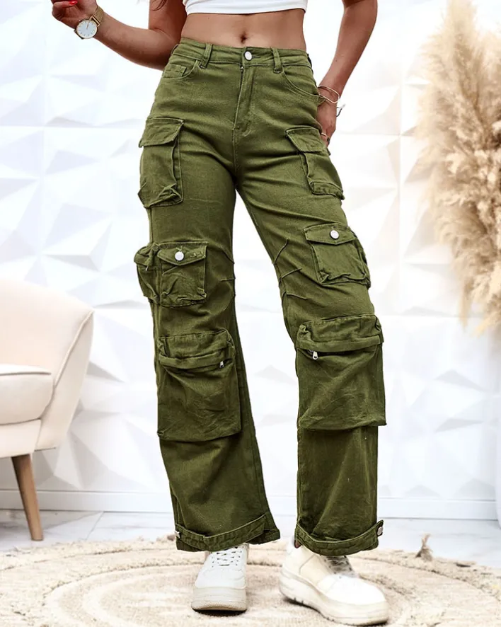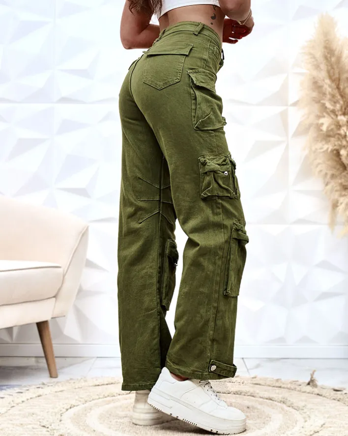 - Kultowe damskie szerokie spodnie typu bojówki, wykonane z przyjemnej tkaniny a’la jeans. Model posiada rozciągliwą gumkę w pasie i cztery wsuwane kieszenie.