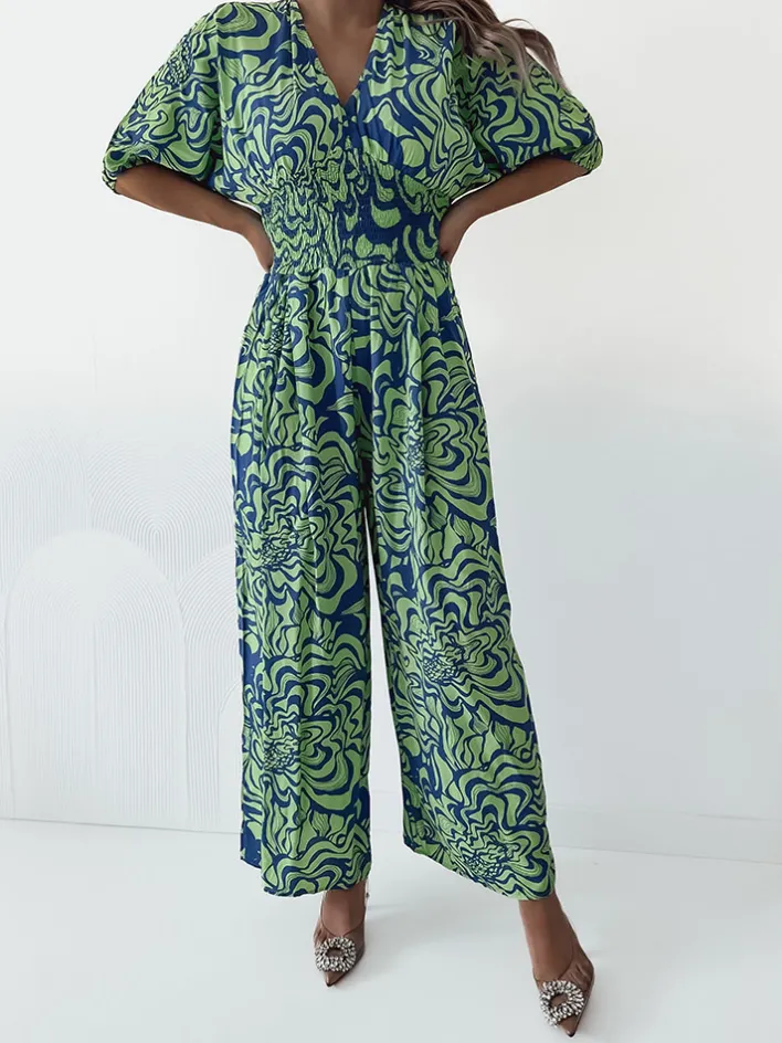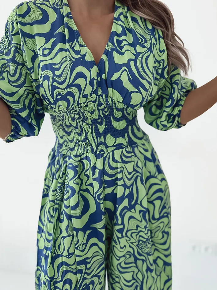 - Wzorzysty kombinezon damski z krótkimi rękawami. Model z dekoltem V oraz gumą w talii. Produkt posiada szerokie, długie nogawki.