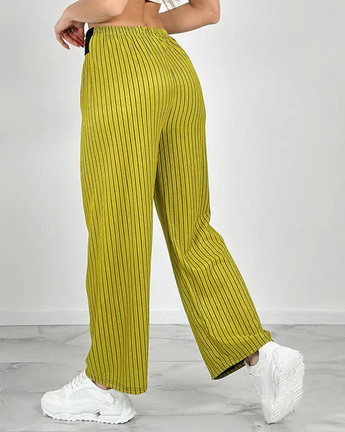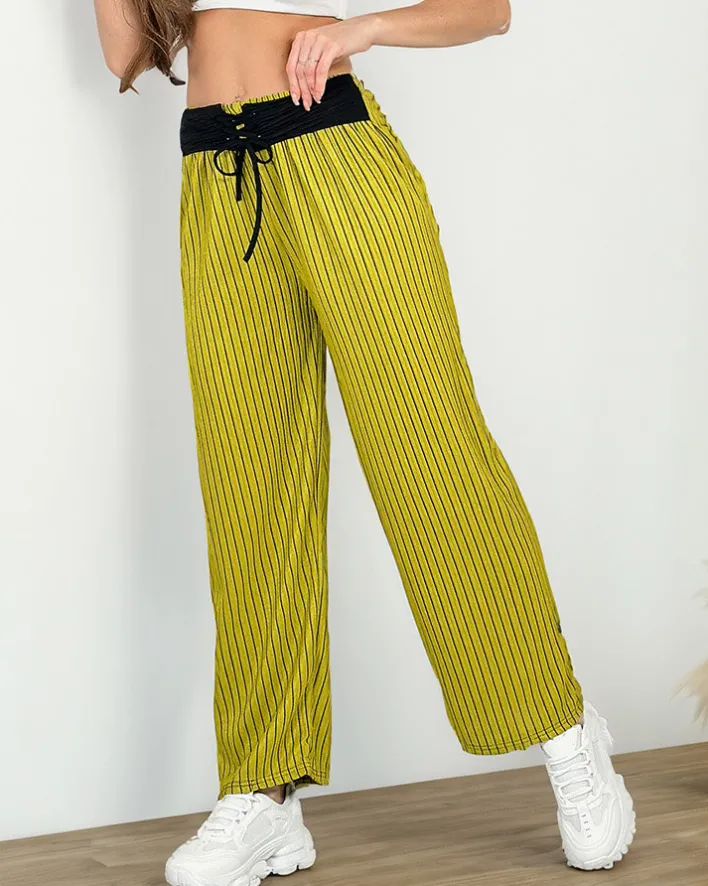 - Fenomenalne szerokie spodnie wykonane z lekkiej tkaniny w paski, model posiada gumę i pasek w talii. Hit tego sezonu! UWAGA: Dokładność pomiaru (+/-) 1 cm.