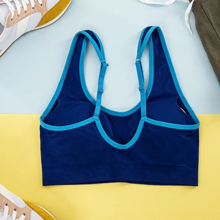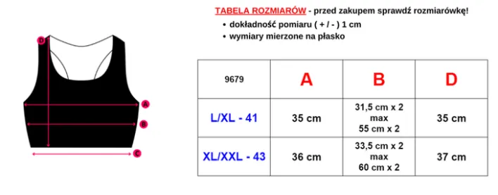 - Sportowy biustonosz damski, wykonany z rozciągliwej tkaniny. Model z regulowanymi ramiączkami i z wyjmowanymi wkładkami. Na dole wykończony szeroką gumką. Idealnie dopasowuje się do ciała.