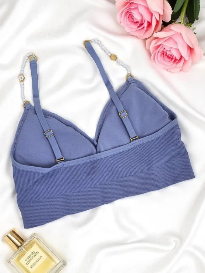- Damski usztywniany biustonosz sportowy z ozdobnymi, regulowanymi ramiączkami, bez zapięcia. Wkładki wyjmowane. Prążkowany materiał łączy styl z wygodą – idealny na trening i co dzień.