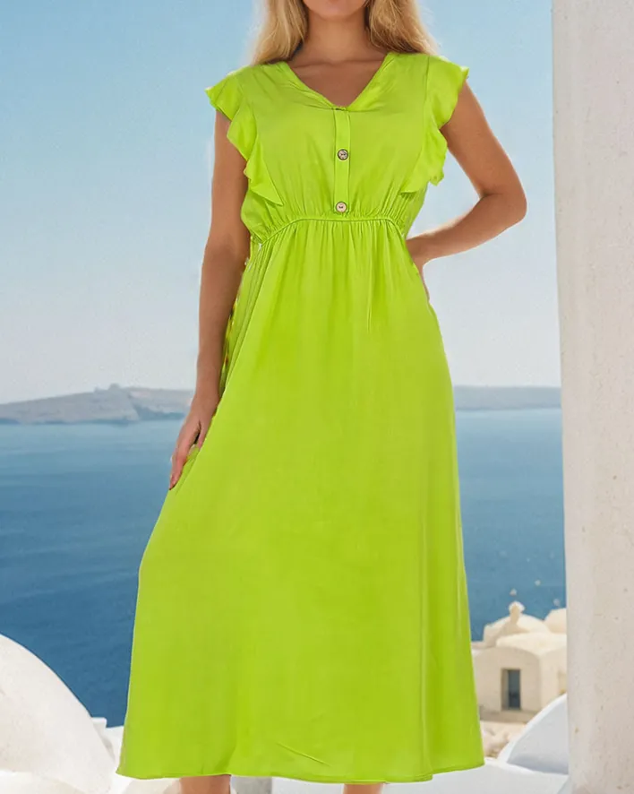 - Jednokolorowa damska sukienka o długości midi, produkt z dekoltem V zdobionym guzikami. Sukienka posiada krótkie rękawy oraz cienką, elastyczną gumę w pasie. Must have w szafie każdej kobiety! UWAGA: Dokładność pomiaru (+/-) 1 cm.