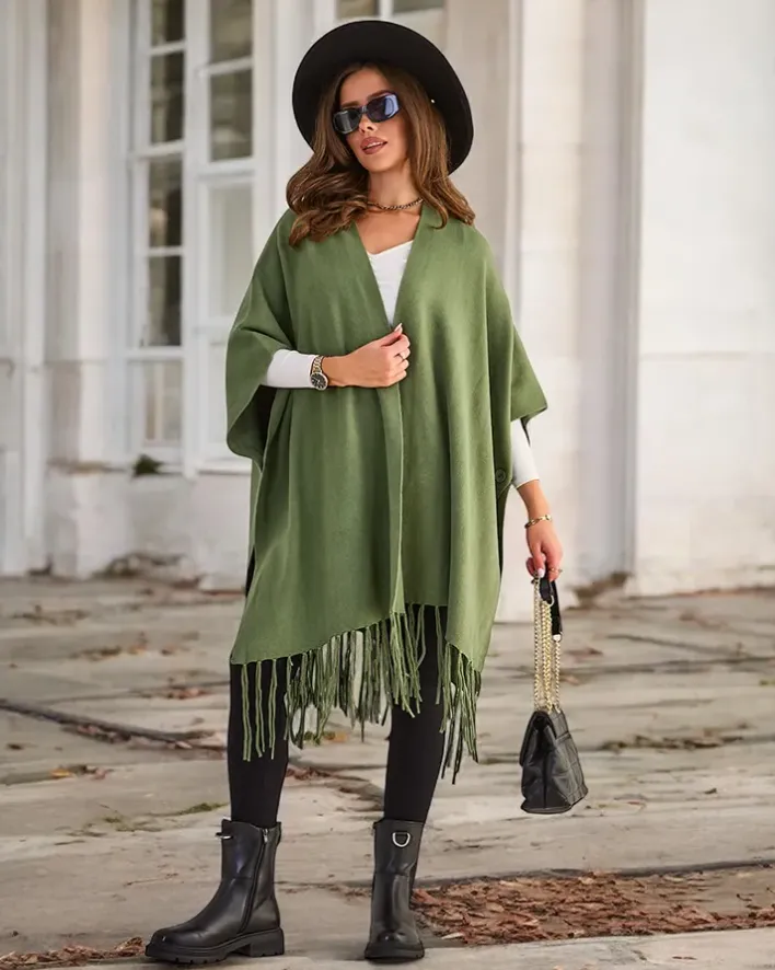 - Eleganckie ponczo damskie z ozdobnymi frędzlami. Miękki materiał, ciepło i styl w jednym. Idealne do każdej stylizacji. Dostępne w różnych kolorach.