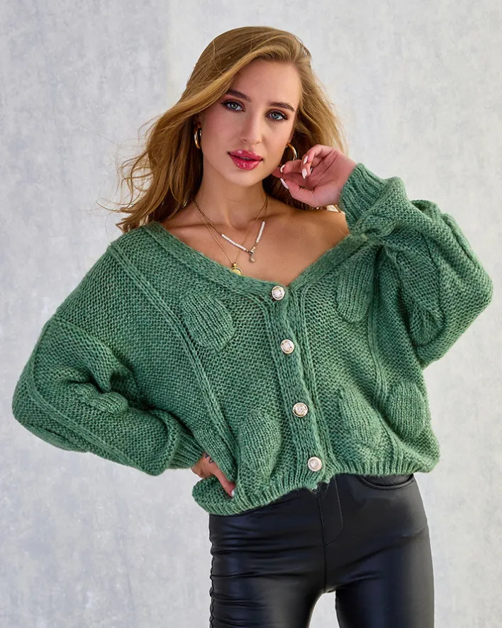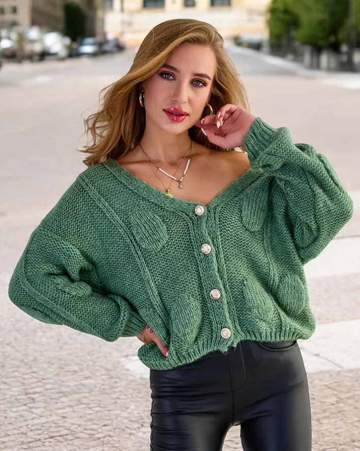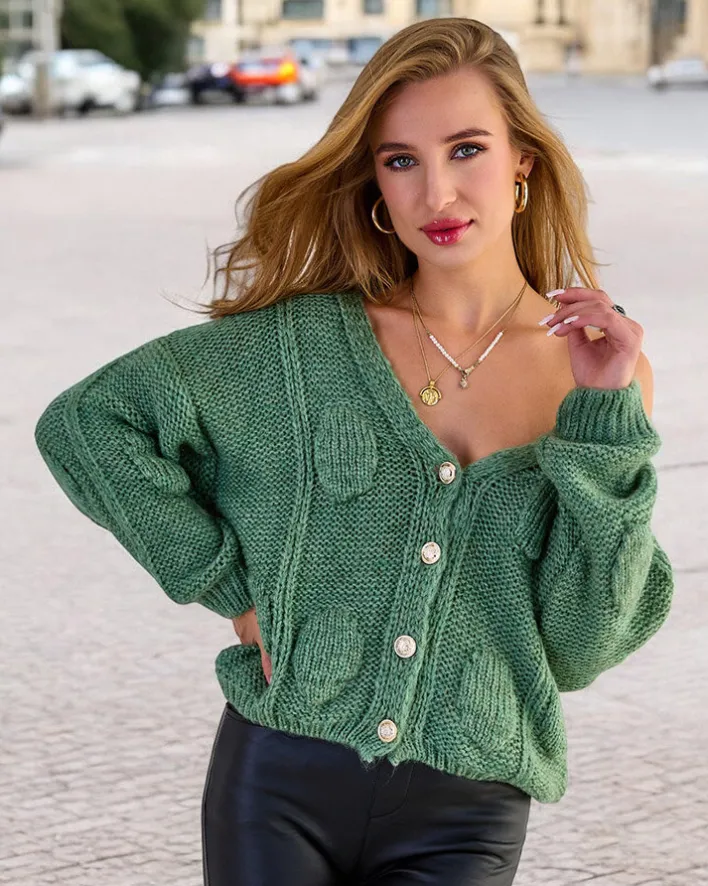 - Sweter damski z dekoltem w serek wykonany z przyjemnej dzianiny. Model posiada ozdobne odpinane guziki. Idealna baza na chłodniejsze dni!