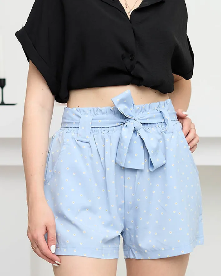 - Wygodne i zwiewne krótkie spodenki wykonane z tkaniny bawełnianej. Model z 2 kieszonkami, elastyczną gumką i dodatkowym wiązanym paskiem w pasie. Spodenki w drobne letnie kwiatki! UWAGA: dokładność pomiaru (+/-) 1 cm. Wymiary mierzone na płasko.