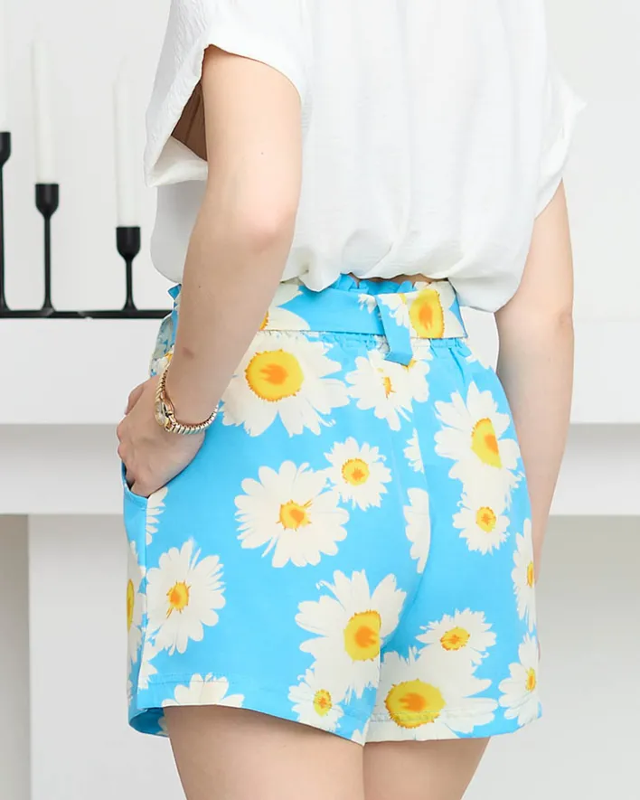 - Wygodne i zwiewne krótkie spodenki wykonane z tkaniny bawełnianej. Model z dwiema kieszonkami, elastyczną gumką i dodatkowym wiązanym paskiem w pasie. Spodenki w jasne letnie kwiaty! UWAGA: dokładność pomiaru (+/-) 1 cm. Wymiary mierzone na płasko.