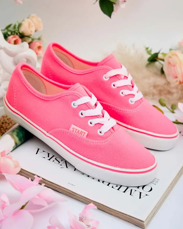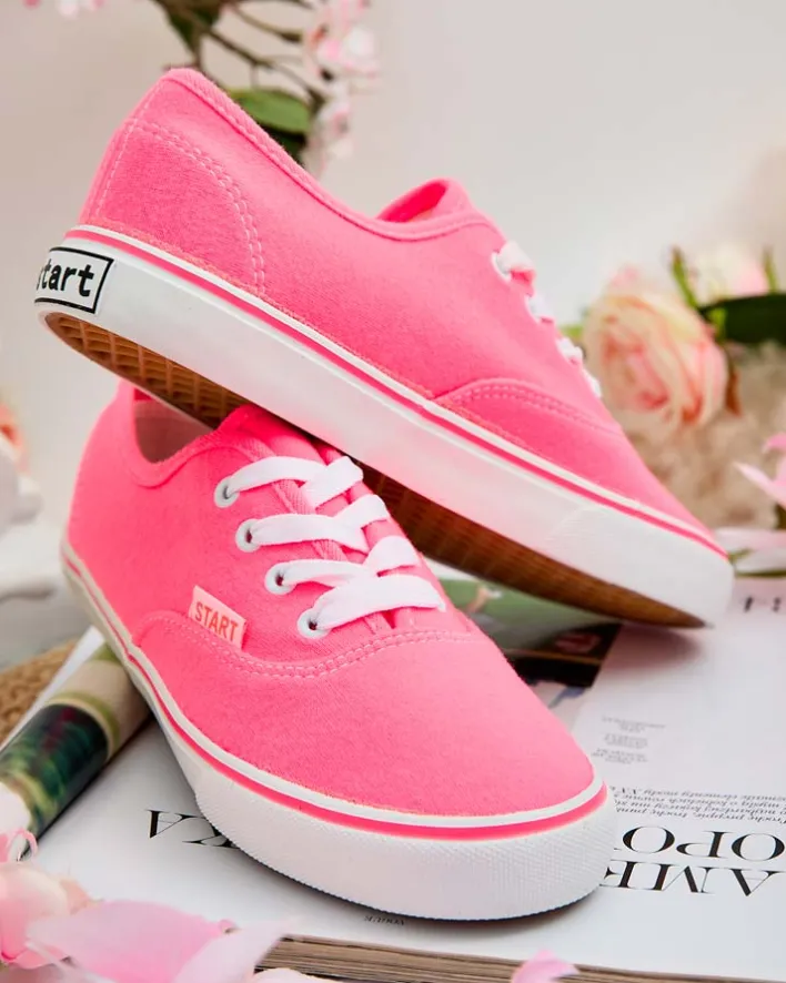- Lekkie damskie buty sportowe w stylu tenisówek na płaskiej podeszwie. Sznurowana cholewka wykonana z tkaniny. W środku wkładka z materiału tkaninowego. Świetnie sprawdzą się podczas letnich spacerów!