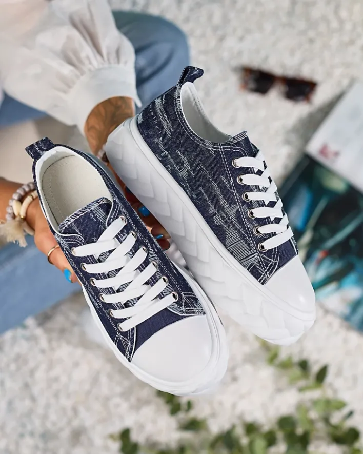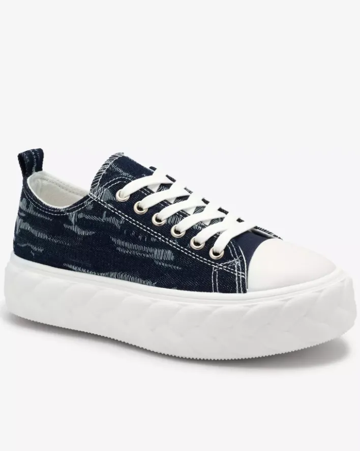 - Mega stylowe damskie trampki wykonane z materiału tkaninowego typu jeans. Model na grubej platformie zdobionej tłoczeniem a’la warkocz. Cholewka jest sznurowana. Będą świetnie pasowały do codziennych stylizacji!