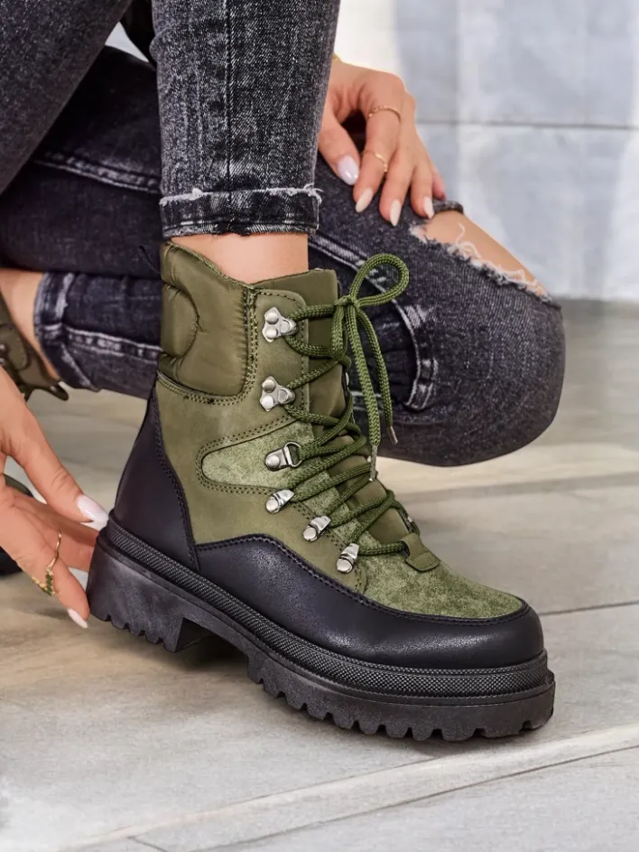 - Wyjątkowe trapery damskie, wykonane z połączenia eko skóry, eko skóry matowej i tkaniny. Model posiada sznurowaną cholewkę. Od środka wypełniony grubszą pianką i tkaniną. Konkretne buty na złą pogodę!