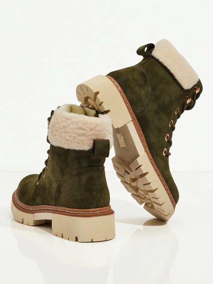 - Damskie trekkingowe trapery ze sznurowaną cholewką. Materiał wykonania to skóra ekologiczna zamszowa. W środku ocieplone delikatnym kożuszkiem. Idealne na zimowy czas!
