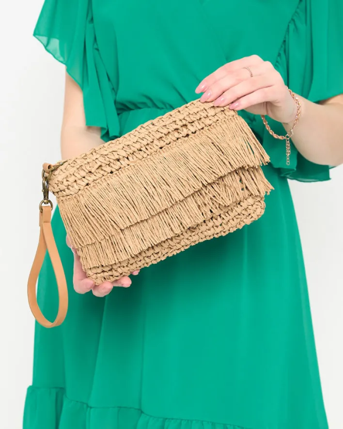 - Mała damska prostokątna torebka wykonana z plecionej, papierowej słomki. Zapinana na suwak, nie posiada kieszonek, dodatkowo eko-skórzany paseczek.