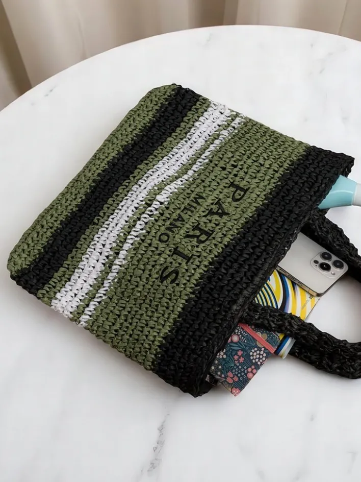 - Duża, pleciona torebka słomiana z paskowym wzorem. 1 komora, kieszonka, zamek. Idealna na lato – pojemna, stylowa i gotowa na każdą przygodę!
