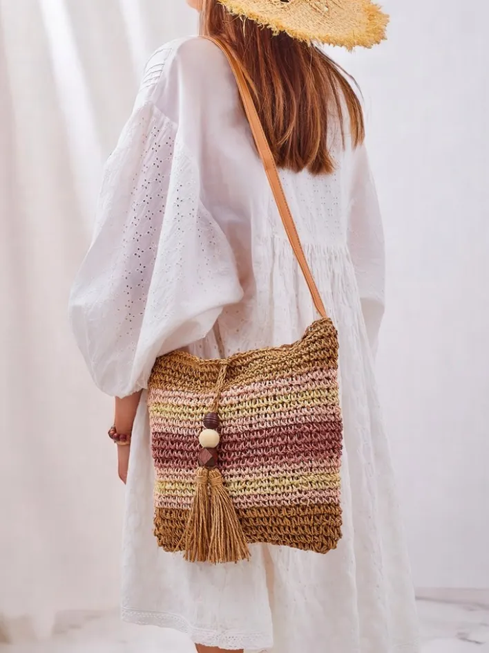 - Mała, pleciona torebka słomiana z wzorem w paski i ozdobnym breloczkiem. 1 komora, kieszonka, zamek. Stylowa i lekka – idealna na lato i spacery!