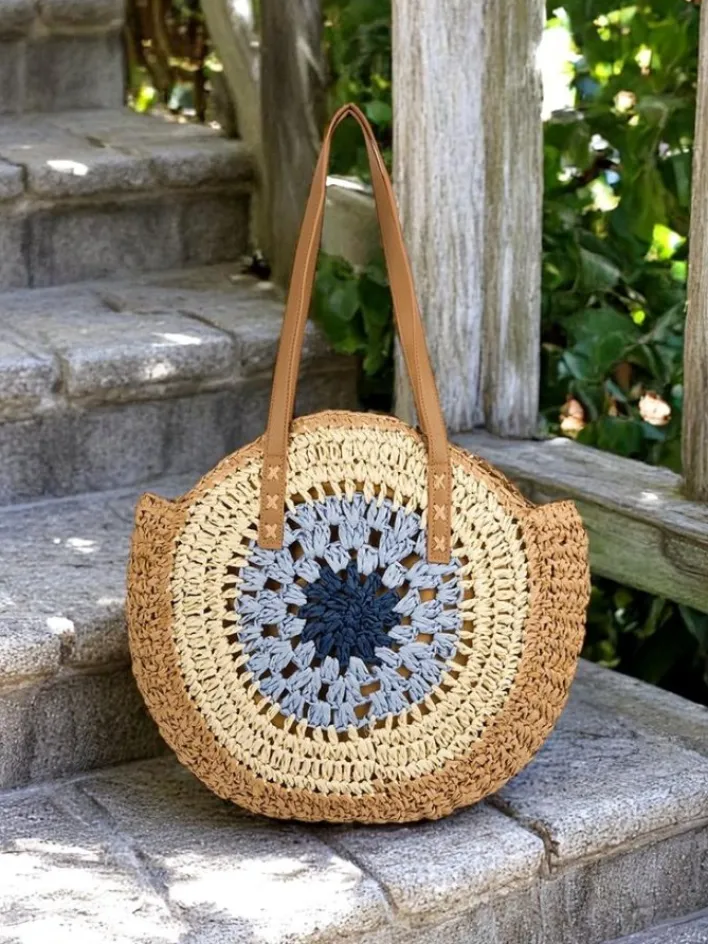 - Duża, półokrągła torebka słomiana z plecionki, ozdobiona kwiatowym wzorem. 1 komora, kieszonka, zamek. Idealna na lato, plażę i stylowe wyjścia!
