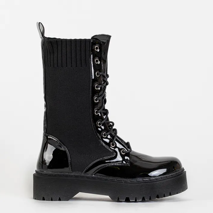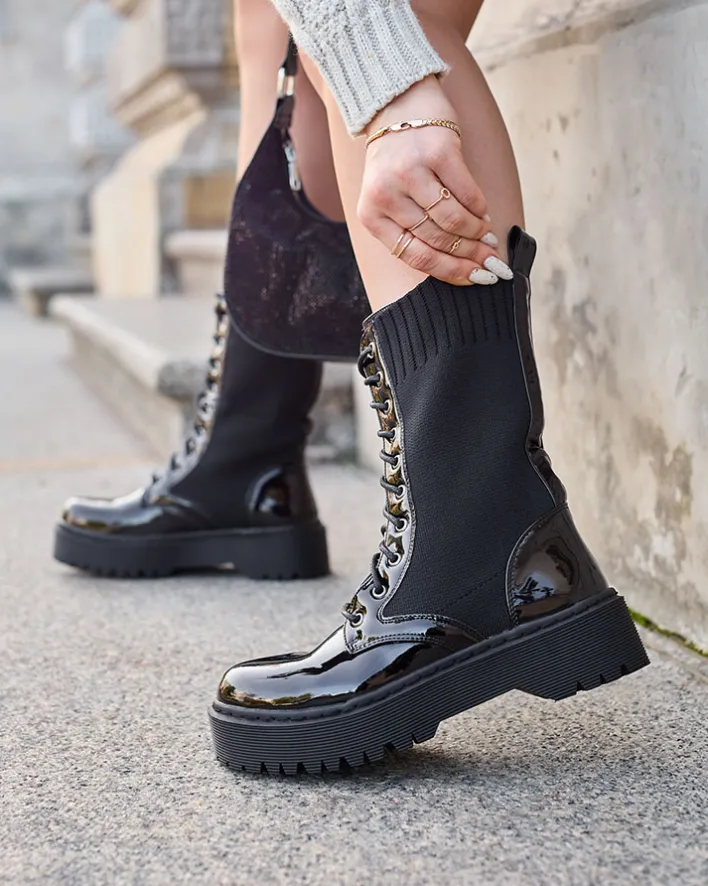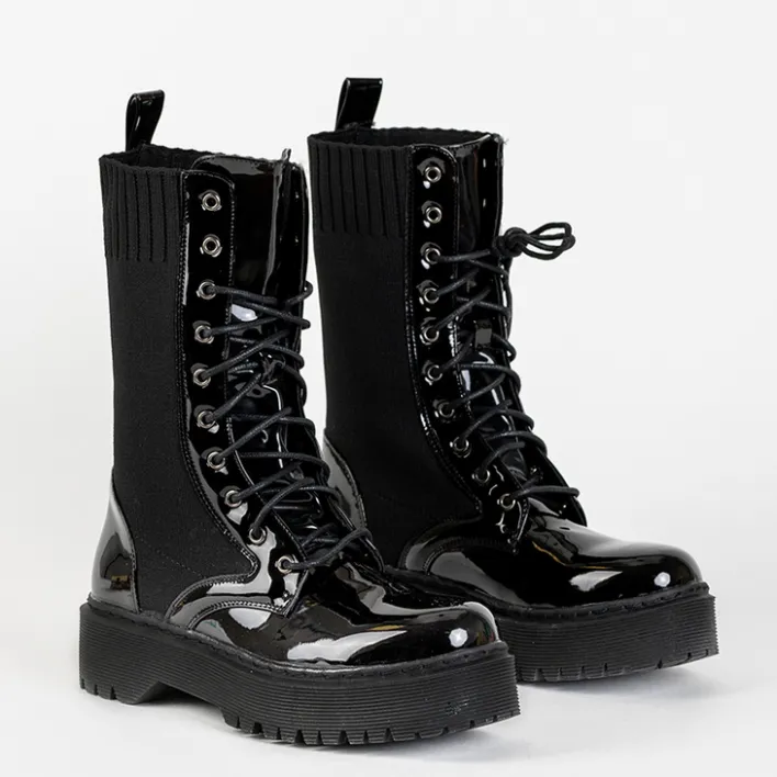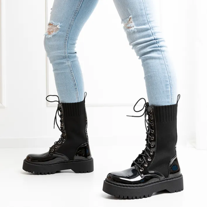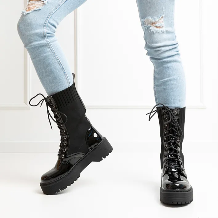 - Stylowe workery wykonane ze skóry ekologicznej lakierowanej oraz elastycznej tkaniny. Wkładka z futrzastego materiału. Model sznurowany. Buty posiadają platformę i sięgają do połowy łydki. CZARNE BUTY ZIMOWE BOTKI NIEOCIEPLANE KIKIZO